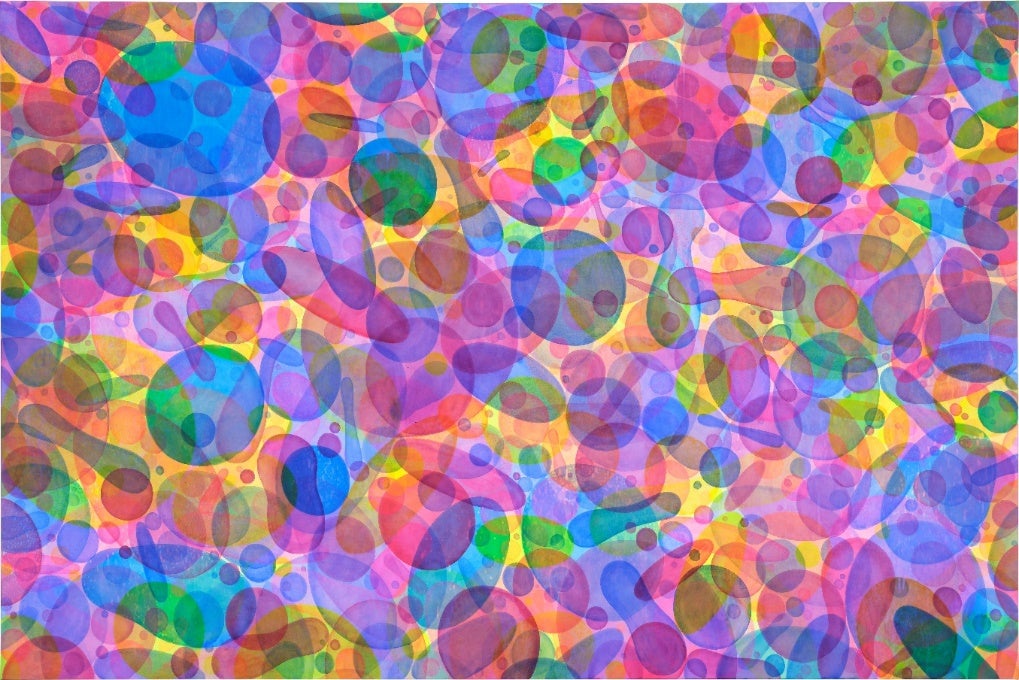 In addition to a series of exquisite works that express Huang Yuxing's passion for traditional Chinese landscape and craftsmanship, this exhibition also offers a work from the artist's well-known Bubble series. This series of works joyfully depicts Huang Yuxing's profound reflections on the experiences of time and space through visual metaphors of organic life forms. The Bubble series is an unapologetic celebration of Huang Yuxing’s deep reflection on the human experience in time and space. Huang’s artistic practice entails a long-running investigation into the individual’s life experience in parallel to the natural world. Stemming from reoccurring motifs of rivers and swirls in the artist’s oeuvre, the Bubble series discusses the topic of dissolution, demonstrating a sense of eternity that underlies the ephemeral existence of bubbles themselves. The human experience is visually represented as bubbles caught in various states of motion, as fleeting and volatile as the temporary existence of an individual’s life. Huang’s signature approach during this period was to superimpose geometric forms delineated in thinly veiled neon colours to create delicate depth and texture, which is well-demonstrated in Bubbles.