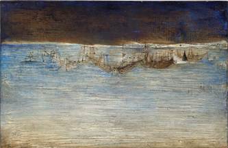 At the center of the exhibition is Retour de pêche (illustrated page 1), a 1953 work that marked a pivotal moment in Zao’s career as he shifted from still-life compositions toward abstraction. The present work depicts a sweeping oceanic vision where indigo light illuminates two-thirds of the canvas and vessels drift into the night. The sea is articulated through rare, linear brushwork that layers rippling waves into rhythmic order, recalling the Water Painting (Shui Tu) tradition of Song master Ma Yuan—whom Zao deeply admired—and lending the work a distinctive resonance within his early oeuvre. The piece occupies an especially important place in his artistic development, and its distinguished provenance further enhances its significance, having once belonged to New York collector Patti Birch, an early and ardent champion of Zao’s art.