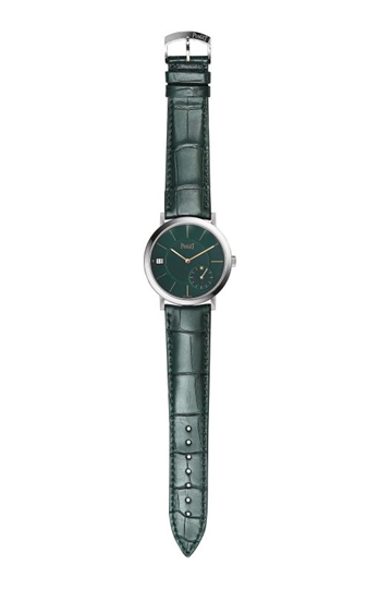 Diameter: 40mm Thickness: 6.36mm 18K white gold case Dial in green lacquer with pink gold-colored indexes, hands Piaget Manufacture ultra-thin self-winding mechanical, Small seconds at 5’, Date at 9’, Pink gold oscillating weight (1205P) Secret Altiplano signature at 8’, Star at 12’ in the second counter Sapphire case back with special engravings: “PHILLIPS IN ASSOCIATION WITH BACS & RUSSO” “Limited edition n°00/22” Power reserve: 44 hours Frequency: 21’600 vph / 3 Hz Waterproof: 3 ATM Green alligator strap with 18K white gold ardillon buckle Numbered Limited Edition of 21 pieces