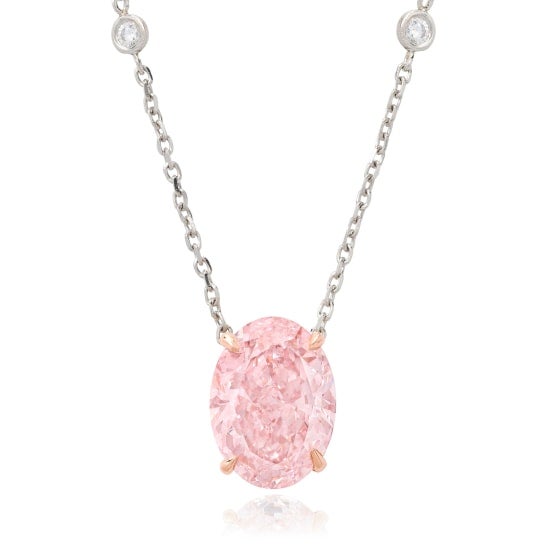 The featured necklace is accompanied by GIA report no. 2155635097, stating that the diamond is Fancy Intense Pink, Natural Color, VS2 Clarity.