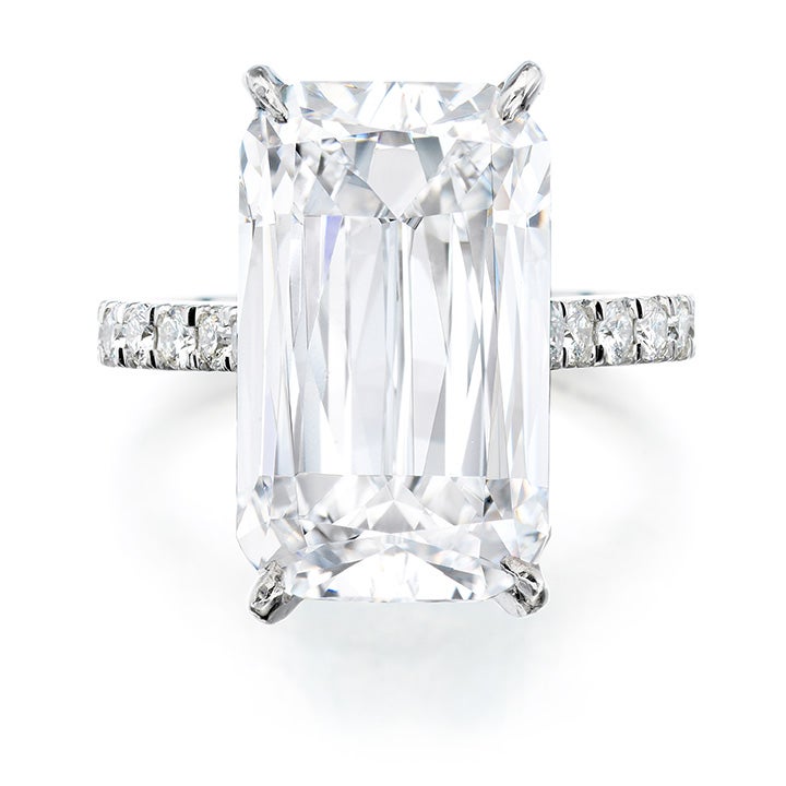 Lot 138’s Boodles Fine Diamond Ring is set with a round-cornered rectangular modified brilliant-cut diamond weighing 8.00 carats and features and enhanced mount with brilliant-cut diamonds, mounted in platinum, size 5, signed Boodles, British hallmarks for platinum, and includes a case stamped Boodles.