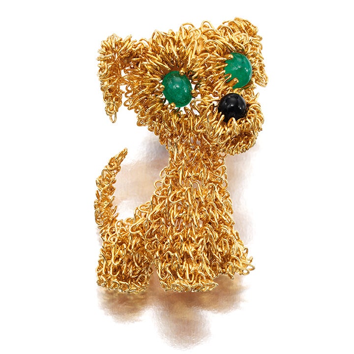 Phillips is excited to offer one of the famous ‘lost puppy’ brooches from the 1950s and 60s ‘La Boutique collection’ of Van Cleef & Arpels. True to the name, the Gold, Emerald, and Onyx Brooch, ‘Puppy’ was created for the ‘Bestiary’ collection and proved to be one of the more intricate designs out of the nine animal motifs. Thus, the brooch had a smaller production line, and became rare and difficult to find. The present lot presents an exciting and unique opportunity for collectors to give one of the ‘lost puppy’ brooches a new home.