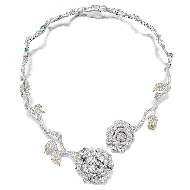 Modeled as two roses joined by a vine, the front pavé is set with near-colorless brilliant-cut diamonds and is accented by brilliant-cut diamonds of yellow tint. The back of the necklace is accented by cabochon opals, mounted in 18K white gold, and signed ‘Wendy Yue’.