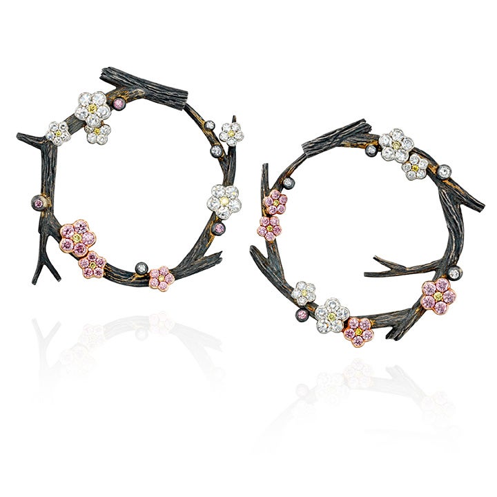 David Michael’s Pair of Colored Diamond and Diamond Earrings, 'Blossom' are each designed as a cherry blossom branch accented by brilliant-cut diamonds of pink tint and brilliant-cut diamonds of yellow tint and near colorless single-cut diamonds. Mounted in 18k gold, sterling silver, and platinum, one features maker's mark, and both include post fittings with locking push backs and a case stamped David Michael.