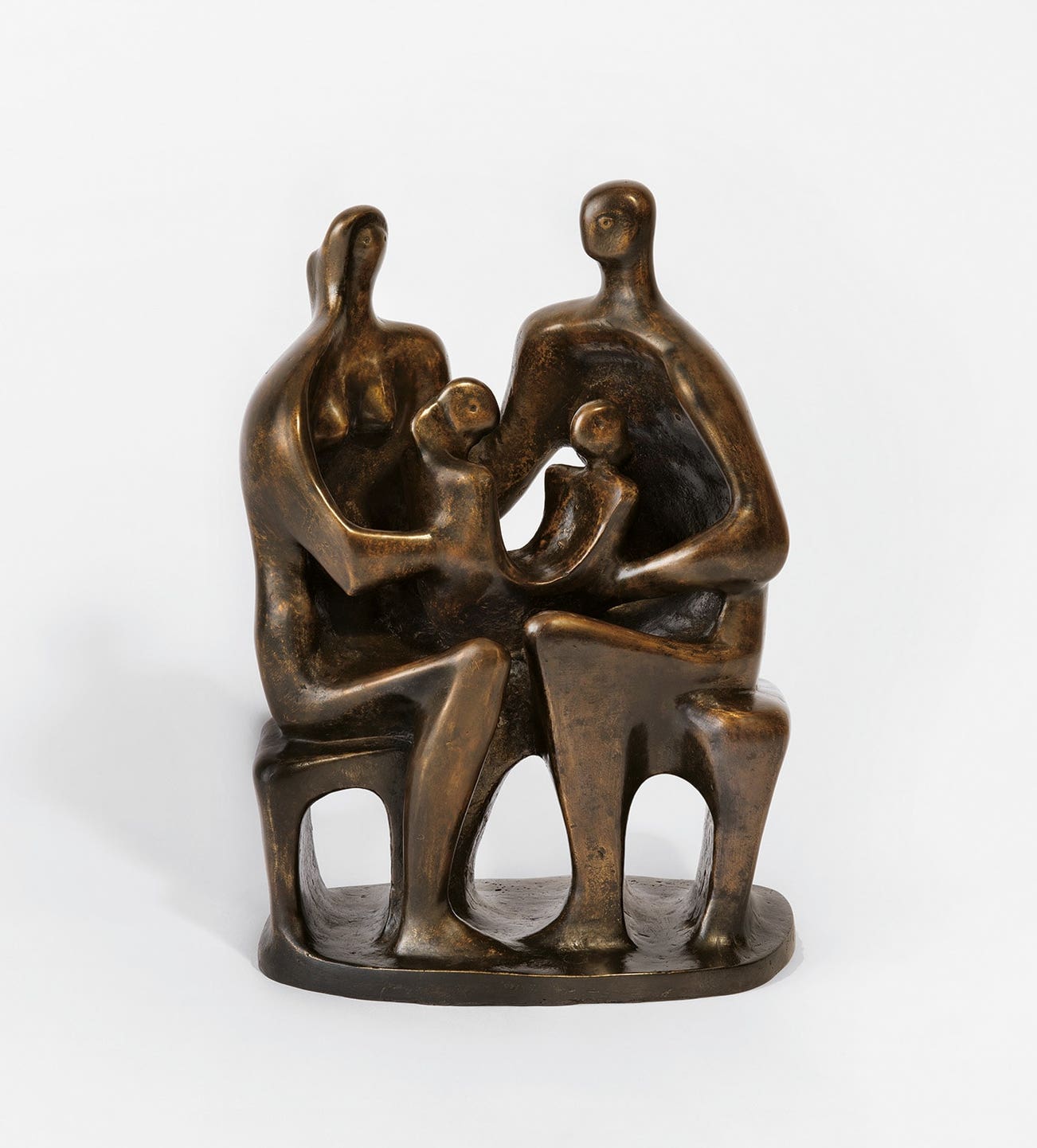 Henry Moore’s Family Group sculptures made between 1946 and 1947 represent a pivotal moment in his career. In these works such as the present one, he abandoned the naturalistic approach he took in 1944 and 1945 in favor of a more abstracted arrangement of the figural group. Depicting a mother, father and two children in softly rounded forms angled towards each other, the present example was cast at a critical point in Moore’s life both personally and professionally. In 1946, just one year before this work’s creation, Moore and his wife, Irina, gave birth to their only child, a daughter named Mary, making the subject of family an even more profound statement. In 1948, a year after this work was conceived, Moore would be awarded first prize for sculpture at the Venice Biennale, cementing his international prominence as a leading post-war artist.