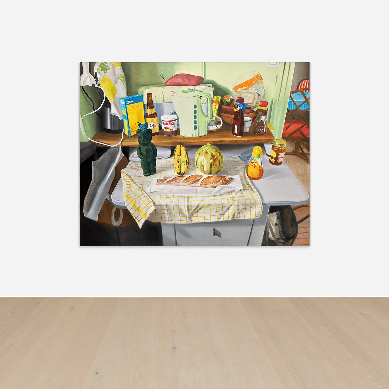 Ulala Imai (b. 1982) was born in Kanagawa, Japan and currently lives and works in Tokyo. Her canvases are typically still life, showing familial life as well as well known imagery from popular culture. Though the objects she paints are personal to her upbringing and her own memories, they are relatable and nostalgic to the viewer as well.