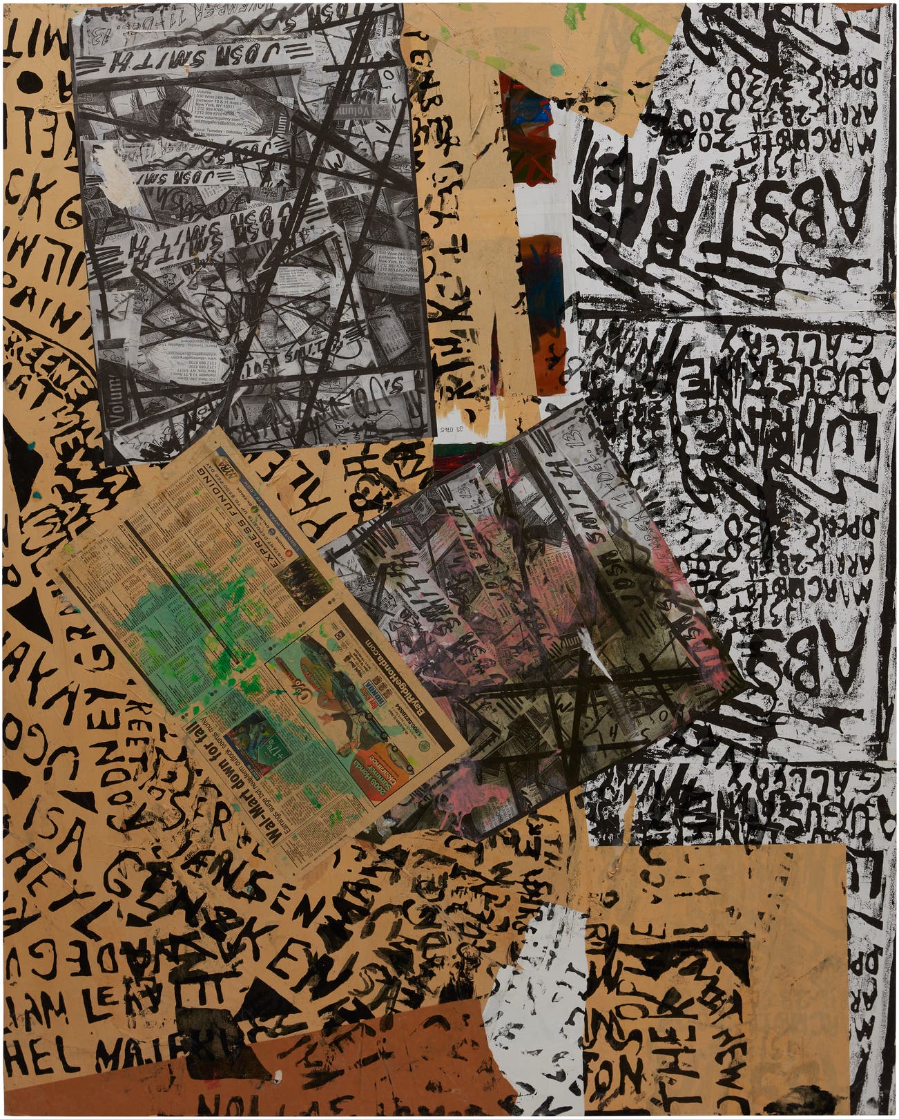 silkscreen, acrylic, paper and printed paper collage on panel