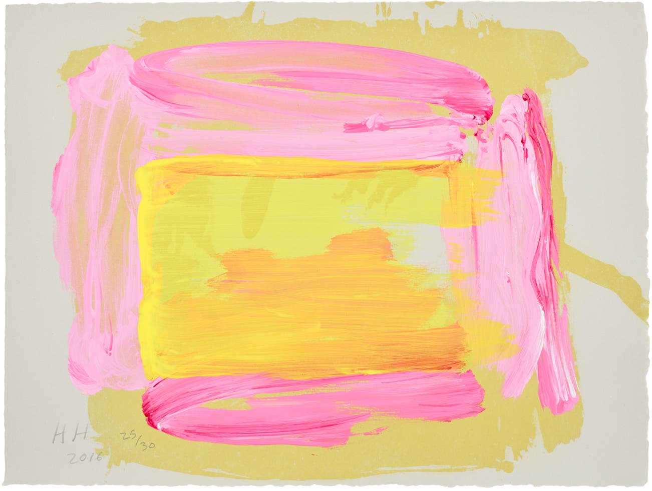 The seemingly casual, urgent quality of his paintings and prints belies a drawn-out process of making: it could take a year for Hodgkin to prepare to execute a single brushstroke. The resultant maximalist, saturated works on canvas, paper, wood and board can be intimately scaled and jewel-like, or oversized, opulent and theatrical. Whilst his early compositions have a collaged, geometric flatness, Hodgkin's later work (including etching and aquatint prints) increasingly incorporated more lush surface textures and complex, fluid patterns reminiscent of the Pahari miniatures from India, of which he was an avid collector.