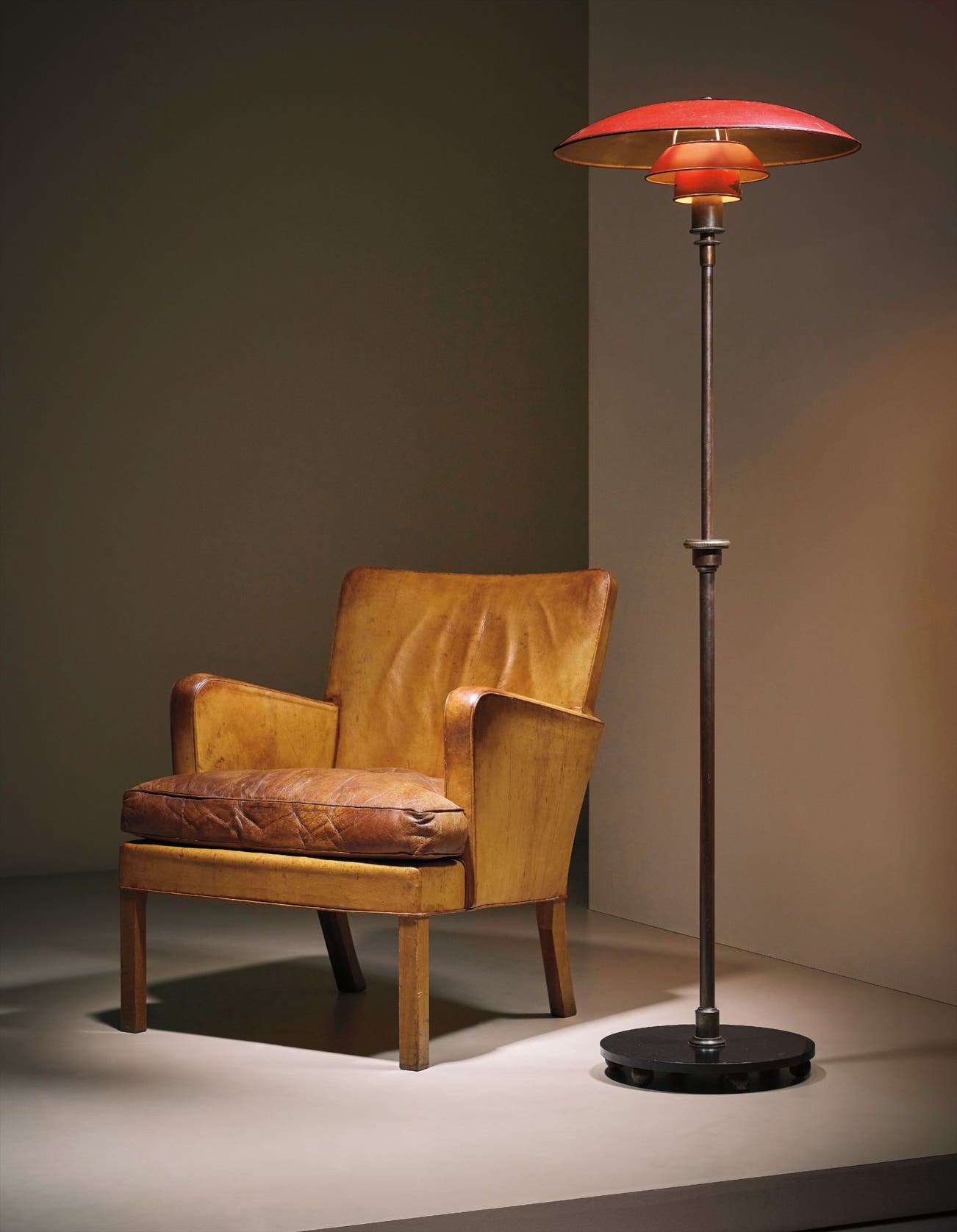 Ib Andersen’s 1927 drawing shows five lighting models from Poul Henningsen’s System PH (illustrated). Henningsen devised this ingenious, rational system to maximise the light produced by an incandescent bulb, with a series of shades—either glass or metal—that could be interchanged according to the demands of the lighting task at hand. Louis Poulsen’s 1927 catalogue of PH lamps advised on which configurations were best suited for particular circumstances, recommending, for example, a matte glass shade on the bottom to spread light over a large area and other arrangements for particular effects of shadow and colour. Henningsen developed this system, which included the present standard lamp (lot 10), the ceiling light (lot 33) and the table lamp (lot 50) before he went on to develop more complex models such as the ‘Spiral’ ceiling light (lot 13) and the counter-balanced ‘Piano’ lamp (lot 19).
