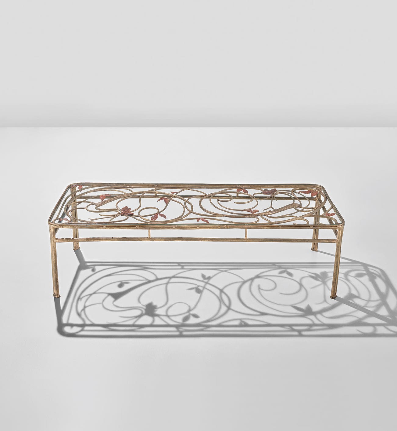 Over her seven-decade career, Claude Lalanne created pieces, from furniture to decorative objects and jewellery, that incorporate depictions of flora and fauna in surprising and beautiful ways. For example, the present table appears light and whimsical despite being made in bronze—a testament to her technical mastery—and the artist incorporated silhouettes of two tropical birds into the tabletop’s design. The birds’ flaunting tails morph into a whiplash motif that meanders like a scandent vine growing across the tabletop, while the feathers on its head double as a group of leaves. Her inclusion of these birds is not merely a zoological interest but a reference to the table’s original setting. Lalanne designed this unique table for a patron’s home in the Caribbean, and it exemplifies how Lalanne preferred to create unique pieces for individual clients around the world, most famously for Yves Saint Laurent and Salvador Dalí. In the catalogue for a 1975 exhibition at the Centre Pompidou, art critic John Russell wrote, ‘The Lalannes…like to work for a particular person, or for a particular place. Within those seeming limitations, their imagination operates quite freely, raiding departments of life where imagination has long slumbered’. This unique table certainly reveals Claude Lalanne’s imagination in full force, as it magnifies and extends the beauty of the tropics into a luxurious interior and, as Millet suggested, showcases a powerful ability to translate the commonplace into the sublime.