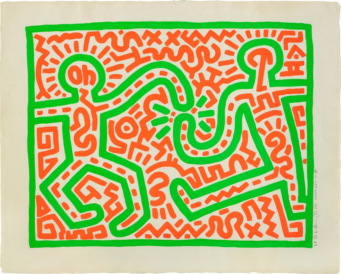 Throughout his tragically brief career, Haring refined a visual language of symbols, which he called icons, the origins of which began with his trademark linear style scrawled in white chalk on the black unused advertising spaces in subway stations. Haring developed and disseminated these icons far and wide, in his vibrant and dynamic style, from public murals and paintings to t-shirts and Swatch watches. His art bridged high and low, erasing the distinctions between rarefied art, political activism and popular culture.