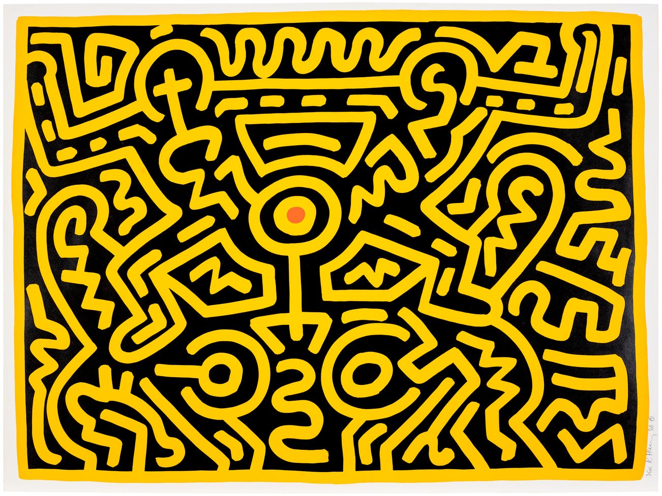 Throughout his tragically brief career, Haring refined a visual language of symbols, which he called icons, the origins of which began with his trademark linear style scrawled in white chalk on the black unused advertising spaces in subway stations. Haring developed and disseminated these icons far and wide, in his vibrant and dynamic style, from public murals and paintings to t-shirts and Swatch watches. His art bridged high and low, erasing the distinctions between rarefied art, political activism and popular culture.