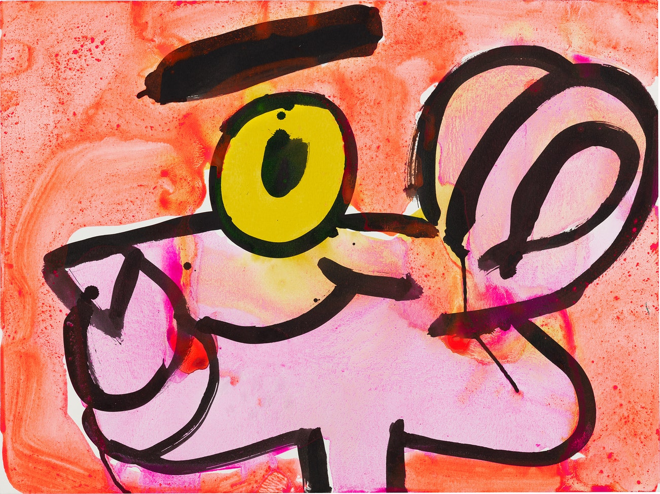 Katherine Bernhardt, whether in her paintings or make-shift Moroccan rugs, is rapt by neons and geometries. The artist, who works in New York, takes an almost hasty-flick of a brushstroke that lands as a jagged architectural form — figures cut in space and in buzzing colors that leave a mental trace.
