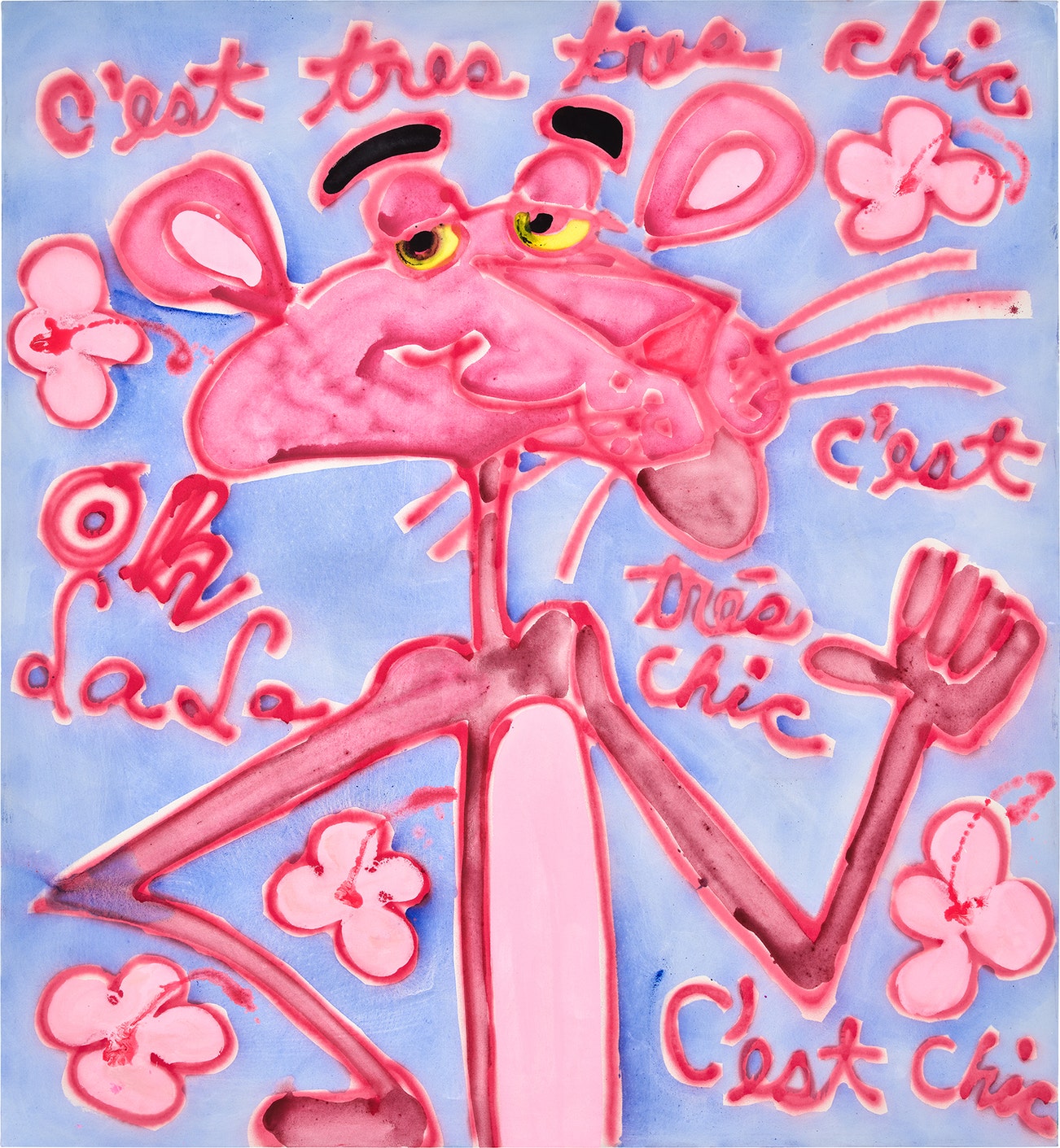 American | 1975Katherine Bernhardt, whether in her paintings or make-shift Moroccan rugs, is rapt by neons and geometries. The artist, who works in New York, takes an almost hasty-flick of a brushstroke that lands as a jagged architectural form — figures cut in space and in buzzing colors that leave a mental trace.