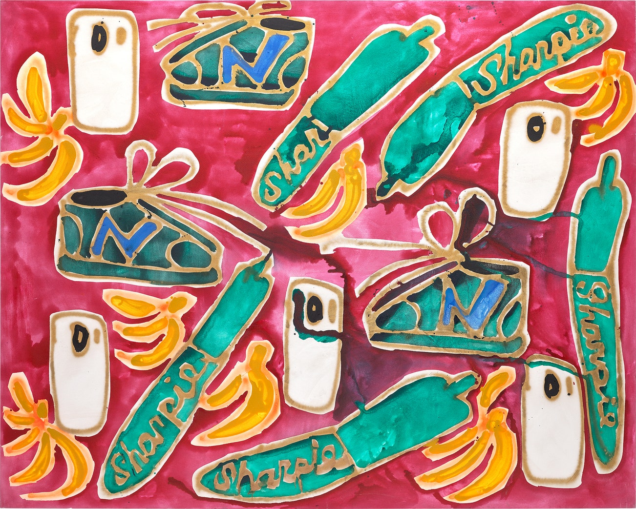 Seemingly each month, multiple galleries, museums or art fairs across the world exhibit Bernhardt's large-scale fantasies and rug-centric installations, as seen in 2017 at Art Basel and with a solo retrospective at the Modern Art Museum of Fort Worth, Fort Worth. "I think the best painters don't intellectualize their own art—they just make stuff," she says; but with sharks circling trash in the water in today's climate, as is depicted in Sharks, Toilet Paper and Plantains, it's not hard to see Bernhardt's deeper meanings.
