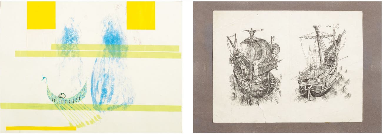 metallic paint, vinyl adhesive, ink, paper collage and found printed paper laid down on fabric