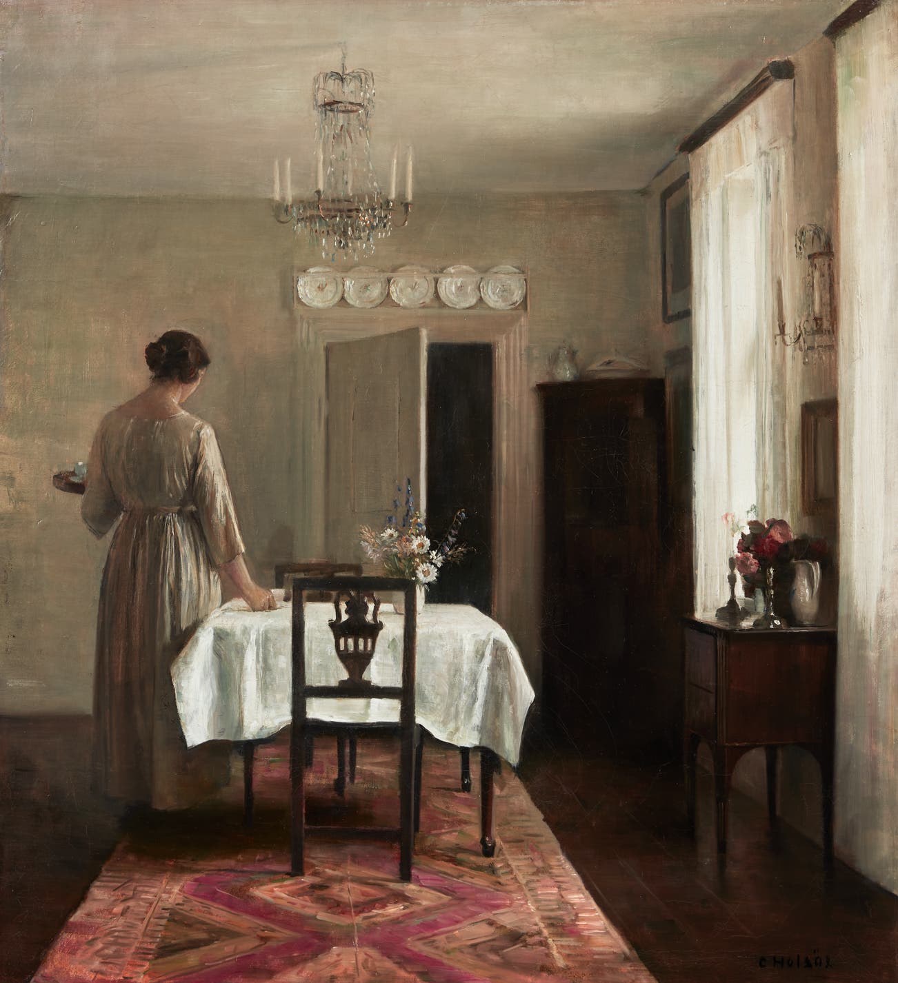 Danish | B. 1863 D. 1935Carl Holsøe (1863-1935) was a central figure in the development of Danish interior painting, articulating a quietly modern vision of domestic space defined by stillness, order, and an atmosphere of introspective calm. Closely associated with Vilhelm Hammershøi and Peter Ilsted, who were described as the Danish Interior School, Holsøe reinterpreted seventeenth-century Dutch domestic traditions within a late nineteenth-century idiom grounded in bourgeois everyday life and subtle atmospheric nuance. His paintings typically depict unoccupied or sparsely populated rooms drawn from his own home, in which controlled light, restrained colour palettes, and carefully structured spatial organisation foster a mood of contemplative intimacy rather than an overt narrative drama. Widely exhibited and celebrated during his lifetime, Holsøe attained international recognition and his work has since been reassessed by modern collectors for its refined synthesis of historical influence and understated modern sensibility.