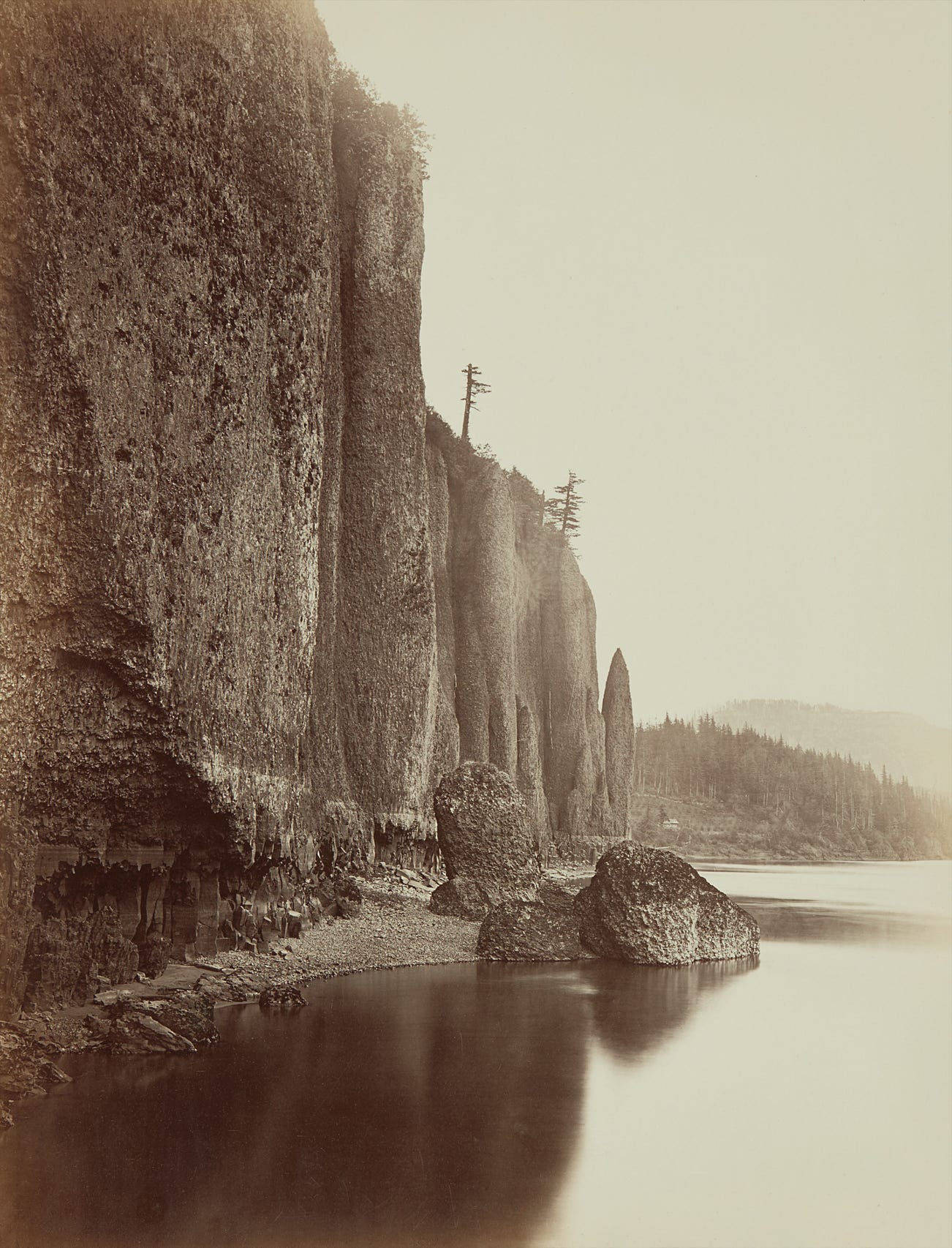 The photograph offered here is of the unusual basalt rock formations jutting out into the Columbia River from what is now Washington State. In the far distance, the beginnings of a small town or village are just visible. When Watkins returned to Oregon in the 1880s, these towns and villages had grown and much of the landscape had changed. The ever-expanding timber mills, the mining operations and ship landings, and the fast-growing cities of Seattle and Portland were the focus of his “New Series” work. In pictures like Cape Horn, Watkins manages to evoke the feeling of unspoiled territory and the primeval grandeur of the Northwest terrain.
