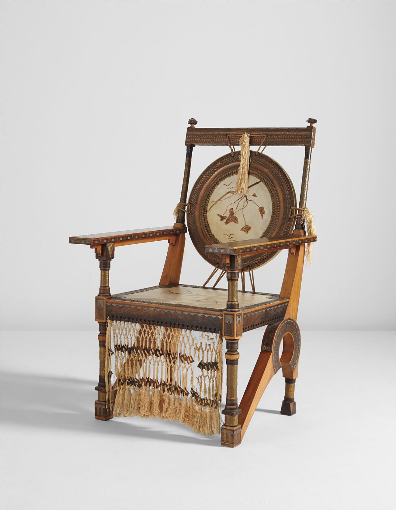 Walnut, ebonized wood, repoussé copper, brass, pewter, painted parchment, silk cord.