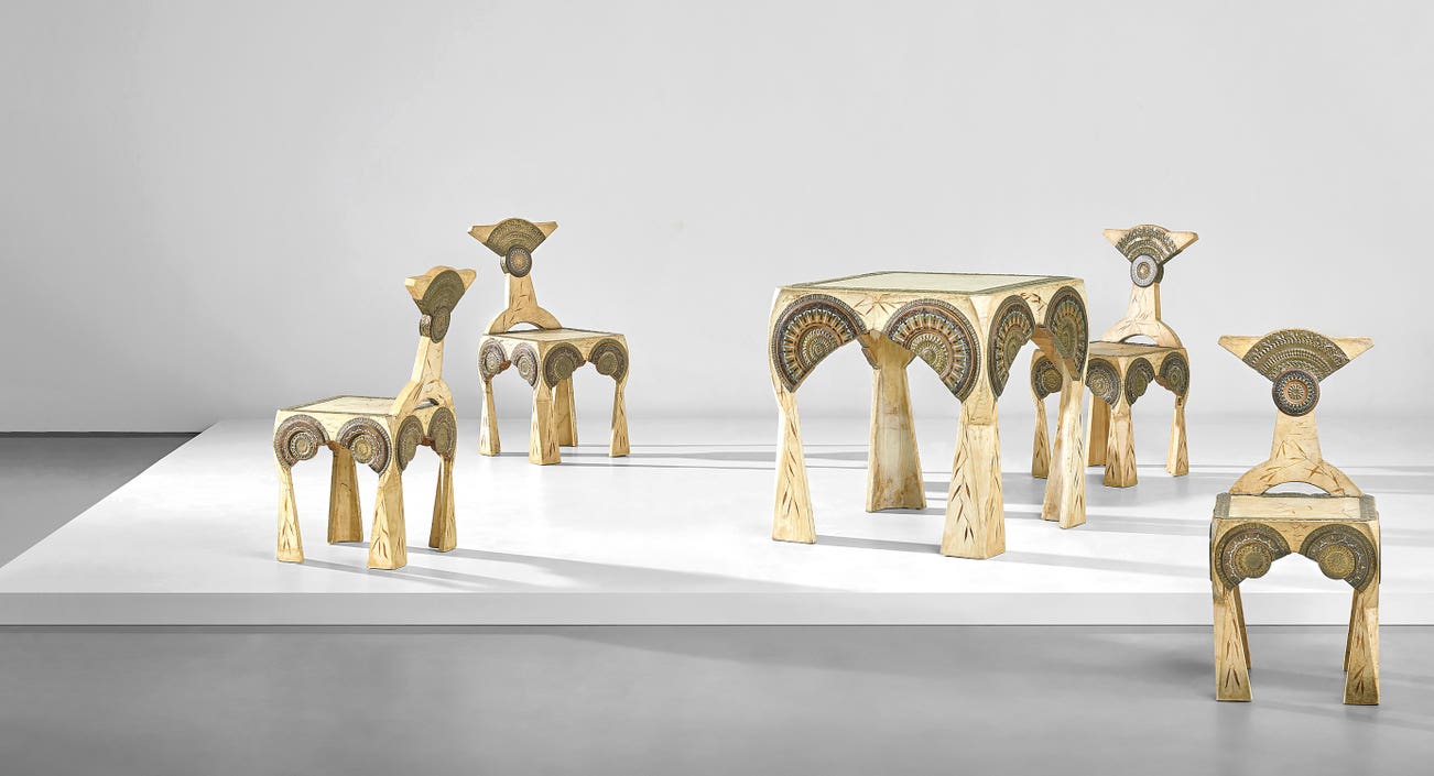 Bugatti was born in Milan in 1856 to chimneypiece designer Giovanni Luigi Bugatti. As a student, Bugatti initially studied architecture in the Egyptian and Islamic revival styles, but he eventually turned to metalwork and furniture design and by the 1880s and 1890s his signature style was solidified. Characteristically, the present lot alludes to Bugatti’s rich reservoir of historical reminiscences and cultural quotations that he developed throughout his career. Painted on the surface of this game table and its set of matching chairs are natural motifs including leafy reeds and silhouettes of flying birds in a brown wash, akin to the stylised subjects one may find in East Asian scroll painting. The table and two of the chairs are also signed ‘Bugatti’ in elegant script using the same pigment. Both the painted subjects and delicate scrawl of his signatures are evocative of Arabic and Japanese calligraphy as well as Minoan art’s love of an ephemeral, idealised natural world. Perhaps Bugatti’s ability to merge these historic referents in such a unique way is due to the fact that the designer never travelled far from his native Milan or his second home, Paris. His ideas came from seeing international expositions and reading natural history books.