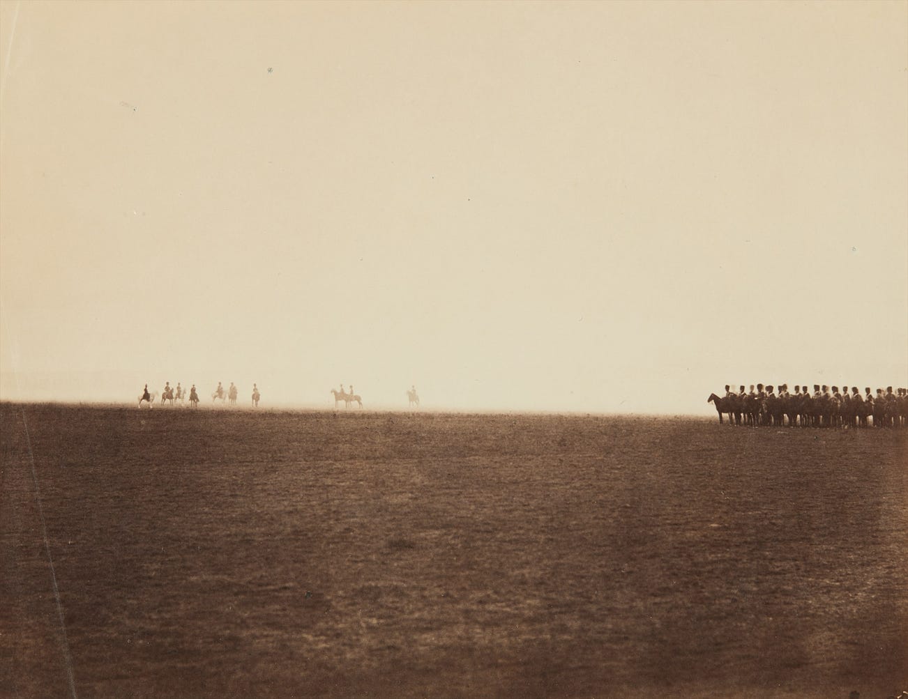 Chronicling the movements of distant battalions across the vast open expanse of the camp would have been a challenge for any photographer, and the cumbersome nature of the wet-plate glass negative process would have limited Le Gray’s mobility substantially. The dust raised by the troops and horses would have both limited visibility and presented a constant danger to the tacky surfaces of Le Gray’s glass negatives. In the image offered here, Le Gray has surpassed these hurdles to create a minimalist tour-de-force.