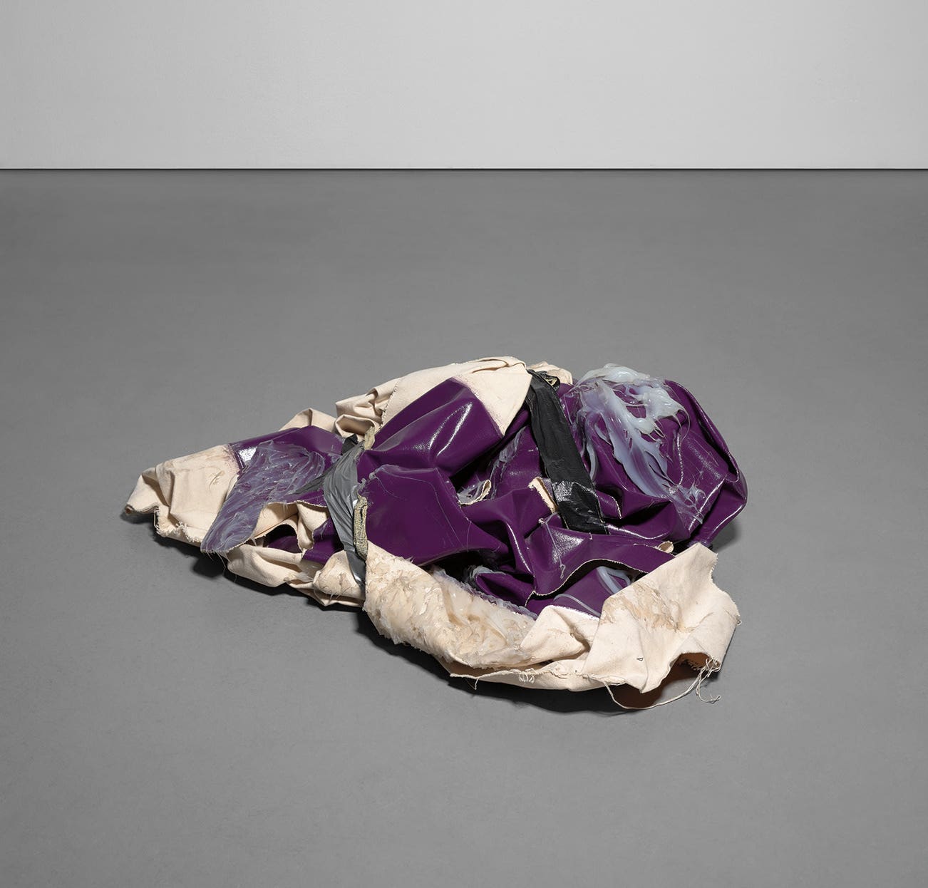 lacquer, silicone, staples, and duct tape on folded canvas