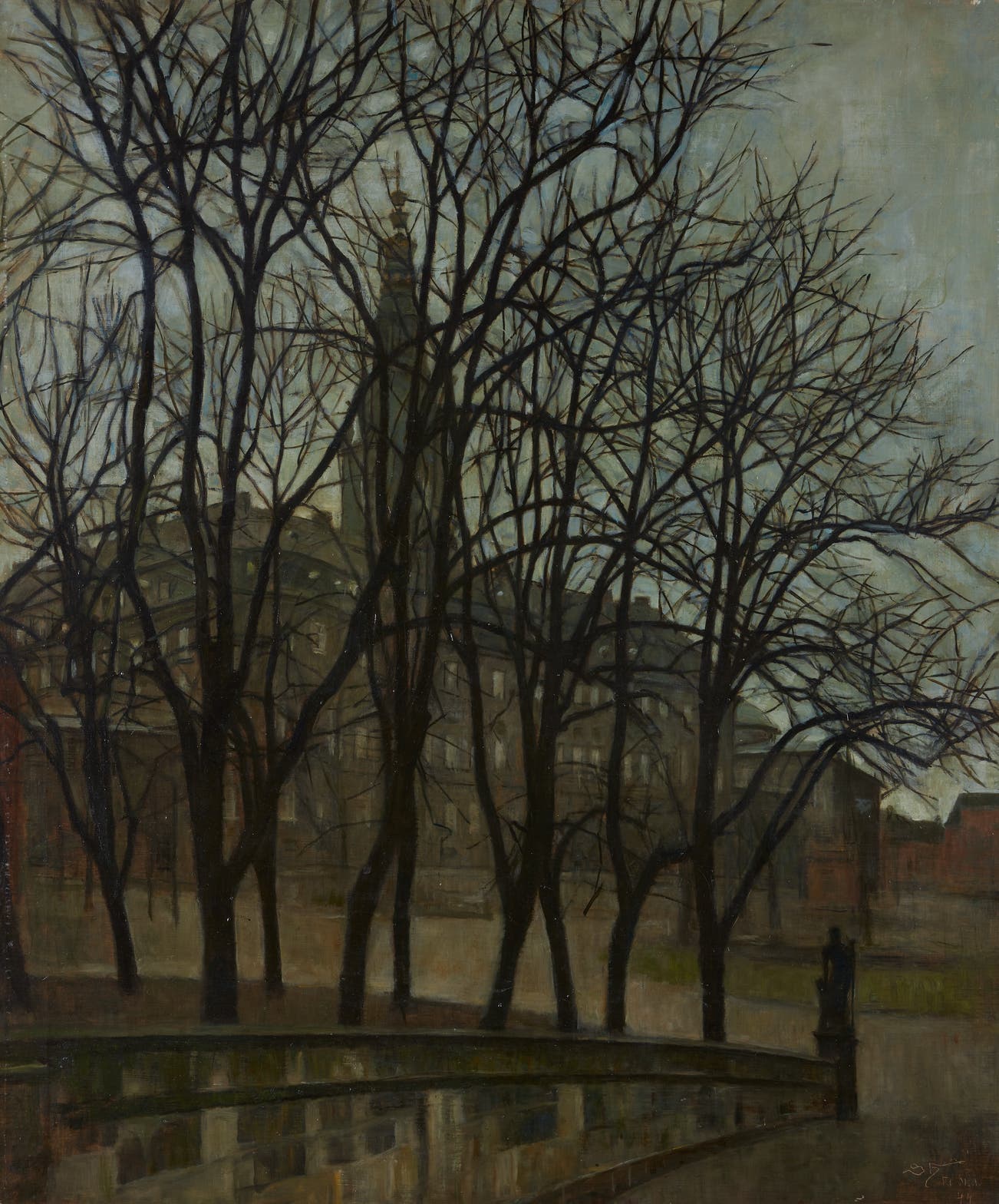 Danish | B. 1873 D. 1948Svend Hammershøi occupies a distinctive position in Danish art around 1900, bridging symbolism, vitalism, and architectural modernity through a multidisciplinary practice encompassing painting, ceramics, and silver design. His paintings, particularly architectural views of churches, castles, and Gothic buildings, are characterized by subdued palettes, inclined perspectives, and dramatic chiaroscuro that transform built environments into introspective, symbolist spaces. At the turn of the century, Hammershøi moved to England, where his works reflected his interest in the local architecture, a thematic emphasis he would carry back with him to Denmark. Closely associated with the avant-garde circle of Den Frie Udstilling, Hammershøi participated in the cultural currents of symbolism and vitalism while maintaining a markedly independent and austere visual language distinct from that of his older brother Vilhelm. Alongside his painting, Hammershøi played a crucial role in the development of Danish decorative arts, producing innovative ceramic and silver designs for Kähler, Royal Copenhagen, and Bing & Grøndahl that advanced the ideals of artistic craftsmanship into the twentieth century.
