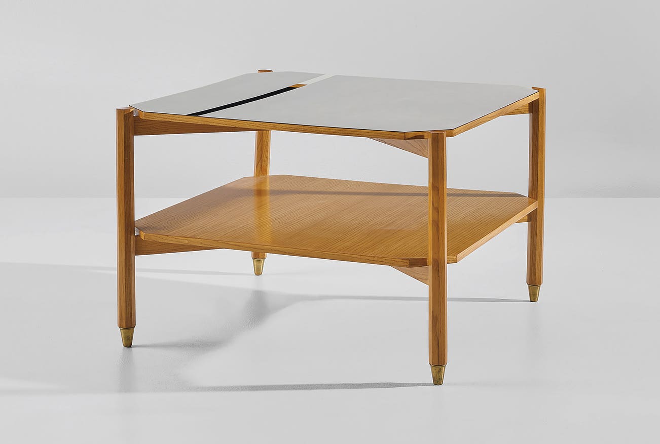 Ponti revisits his 1938 Vanzetti apartment interior, readapting some of its features to the cantilevered sideboard idea. At that time it was divided into four equal parts, but here it is segmented into four parts of varying widths, separated by vertical wooden framing devices that provide an impressive technical solution to obtain an effect akin to levitation. Its two elongated brass handles allow it to be opened from the top, which entertains the client with an unexpected mode of access. Lightness and grace abound in multiple details: the top of the coffee table has an inset strip of black and white laminate set into a field of grey, all supported by hexagonal shaped wooden legs that terminate in brass sabots. In the freestanding sideboard, square handles are smartly recessed into the sliding panels of black or white laminates. These square geometries are in turn bisected by rectangles of alternating black with wood or white with wood, providing results that are both pictorial and wholly abstract. All of these constituent parts add up to playful combinations within these boxes, some are static, some in movement, with their various enclosures alternately sliding back and forth or opening with top lids. The formal unifying principle of recurring interactions between colours and shapes is literally or visually set in motion through asymmetrical relationships, adding up to a scheme, which may recall the ironical researches of Bruno Munari.