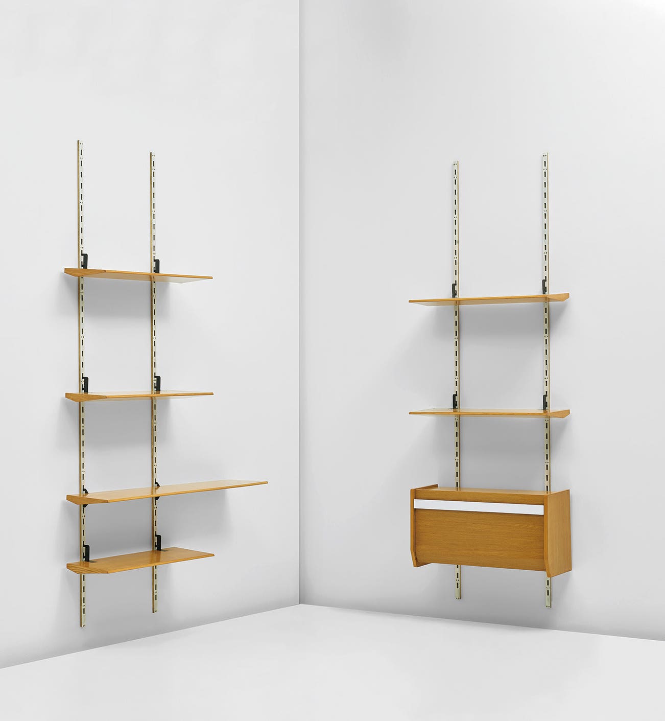 By the time of this mature work of the mid 1960s he had begun to reduce his designs to pure colour and form, articulated by expressive tectonic devices. Using black and white laminates Ponti developed what would become his idiosyncratic positivo e negativo tropes. He leaves behind the hermetic and historical concerns characteristic of his production in the 30s and 40s to invent a world of objects imbued with weightless and elegant movement, as seen in the black and white twin set of opened/closed mobile shelf units on delicate brass castors. Elaborate asymmetries can be read in the three wall mounted bookcases, with one unit displaying an extruded singular shelf that engages the lone white horizontal stripe on the front box case of the secondary shelving system, which in turn plays against the smaller shelf unit consisting of only a solitary black box with hovering glass shelves stacked above.