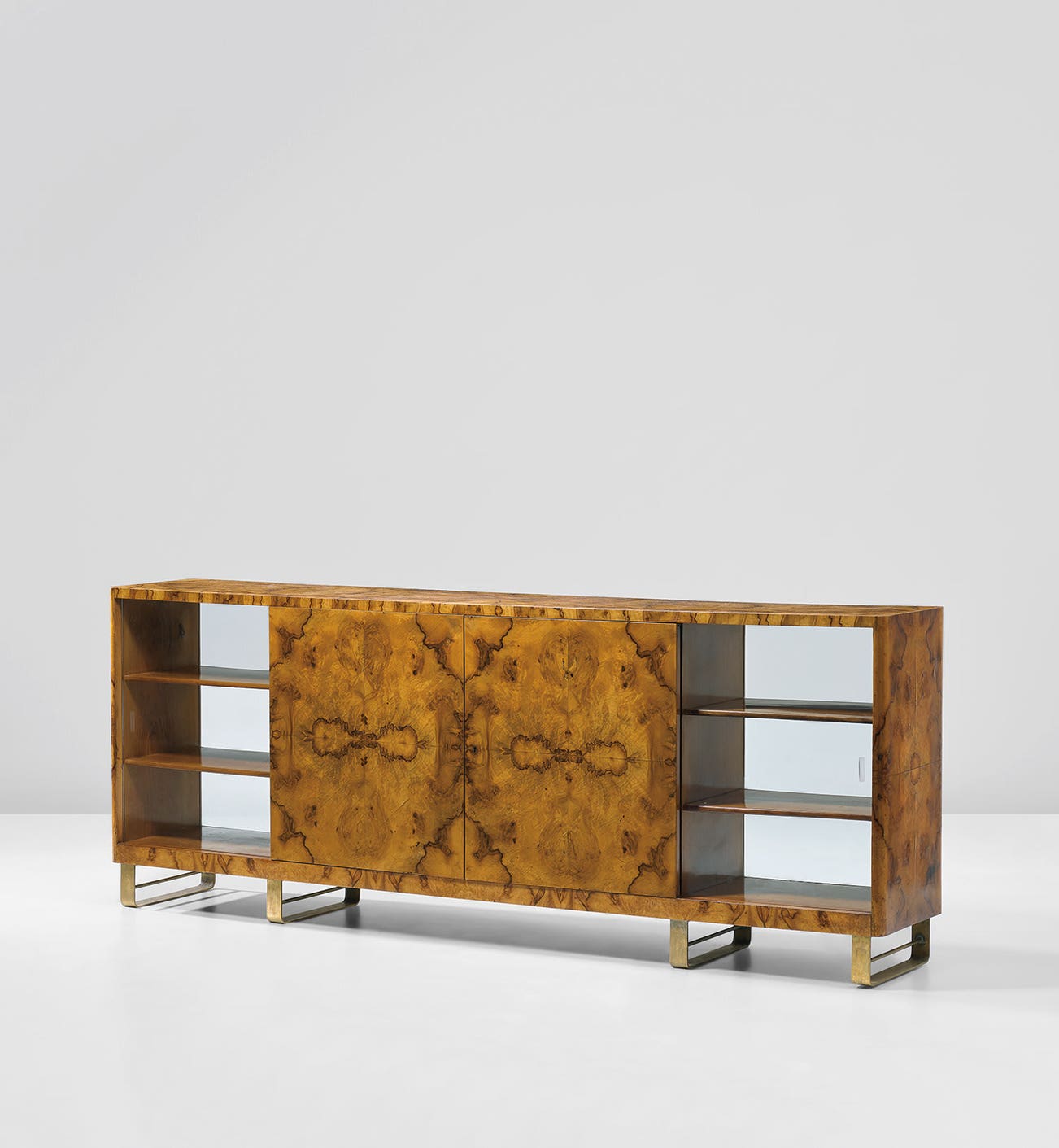 ‘I learned it from Loos, Adolf Loos, the great pioneering Austrian architect (whom I met personally). He used to tell me that the foot and leg of a chair or any piece of furniture must be always ‘a little too thin’, a spire always ‘a little too high’, a bridge always ‘a little too tense’. Always a challenge, always a success’ (Gio Ponti, Amate l'architettura, Genoa, 1957, p. 110). When it came to his own furniture designs, Ponti who had met Adolf Loos probably in late 1920s Paris, seems to have absorbed some of the older master’s methods of articulating interior space. With Loos the ornament was achieved in manipulating natural materials, such as marble or wooden wall paneling cut in book-matched patterns, which imparted a note of luxury to every aspect of these interiors. In the present Ponti sideboard we see his rare use of radica ferrarese (burled root wood), which was cut into halves or quarters and veneered across the expansive surface. This achieved a unity, as well as a slight obliteration of each element within the overall scheme, culminating in an exhilarating kaleidoscope effect obtained by lining the two short ends with quartered veneers.