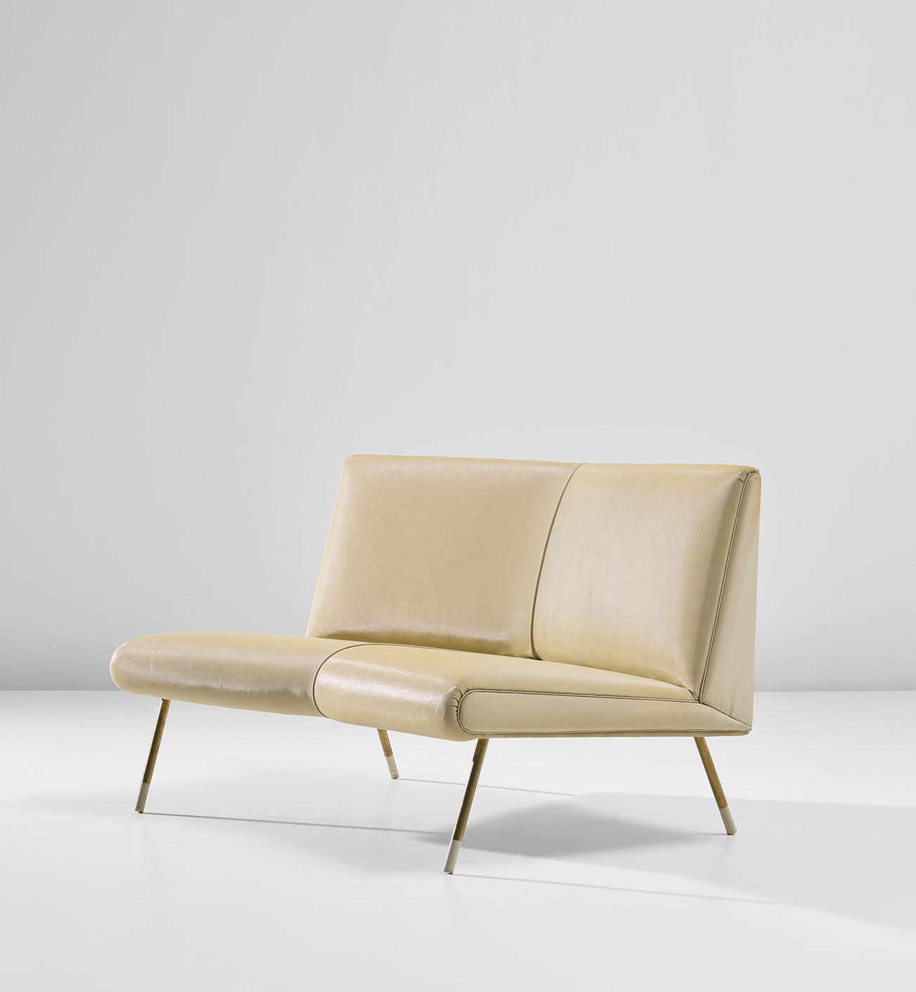 The present austere two-seater sofa turns out to be perhaps the most reductive, but also the most complete embodiment of Gio Ponti’s obsession with the diamond form, whose complex geometries served as a matrix for many outstanding designs in his long career. Starting with the 1953 Distex armchair and soon followed by the Mariposa, a seat concept that first appeared at the Villa Planchart in Caracas and then reemerged in the Mariposa sofa for the 1957 Milan Triennale, Ponti multiplied the diamond form ad infinitum in his most productive decade. A close relative of the Mariposa, however, this time without sides or profiled arms, the present work still retains the essence of the diamond form as a distant memory. In Ponti’s own words the diamond or crystal is a metaphor, ‘used to pursue an image of purity, order, impulse...of eternity, of silence and charm at the same time; an image of closed forms in which everything would be consummated in the rigour of volumes and of thought; and let me add an image of classicism’ (Gio Ponti, Amate l'architettura, Genoa, 1957, p. 29).
