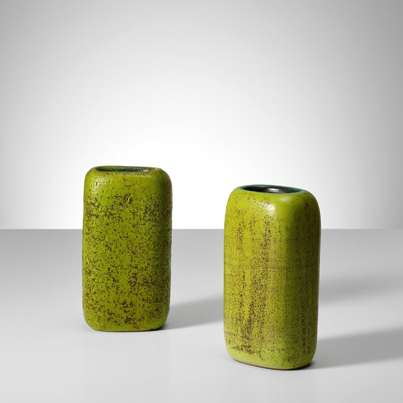 French | B. 1910 D. 1964Working out of his studio in Paris (and later in Aix-en-Provence), Georges Jouve produced sculptural ceramics for modernist interiors. Upon the invitation of Jacques Adnet, the director of the Compagnie des Arts Français (CAF), Jouve participated in various salons internationally and within France, including the Salon des Artistes Décorateurs. He created rigorously simple yet soft and playful forms, including plump, contrapposto vessels, rotund pitchers and cylindrical vases. His tireless experimentation of glazes led to a palette of perfect matte blacks, bone whites and joyful pops of lime green, lemony yellow and, occasionally, selenium red. Jouve's ceramics echo the organic modernism of his CAF colleagues, such as Charlotte Perriand and Serge Mouille.