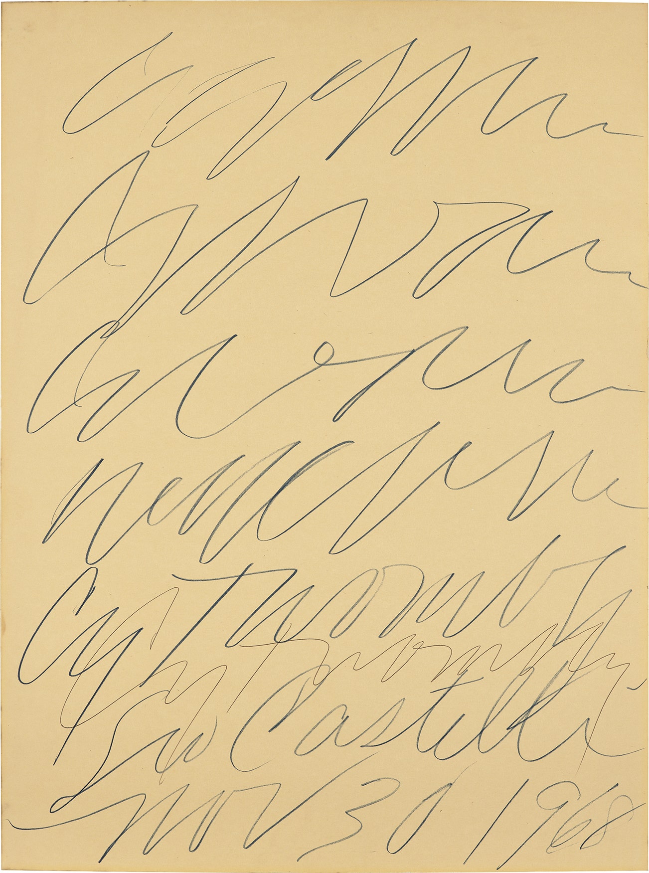 American | B. 1928 D. 2011Cy Twombly emerged in the mid-1950s alongside New York artists Jasper Johns and Robert Rauschenberg. While at first developing a graffiti-like style influenced by Abstract Expressionist automatism–having notably studied under Franz Kline and Robert Motherwell at the legendary Black Mountain College between 1951 and 1952–Twombly was a prominent figure in the new generation of artists that challenged the abstract orthodoxy of the New York School. Twombly developed a highly unique pictorial language that found its purest expression upon his life-defining move to Rome in 1957. Simultaneously invoking classical history, poetry, mythology and his own contemporary lived experience, Twombly's visual idiom is distinguished by a remarkable vocabulary of signs and marks and the fusion of word and text.