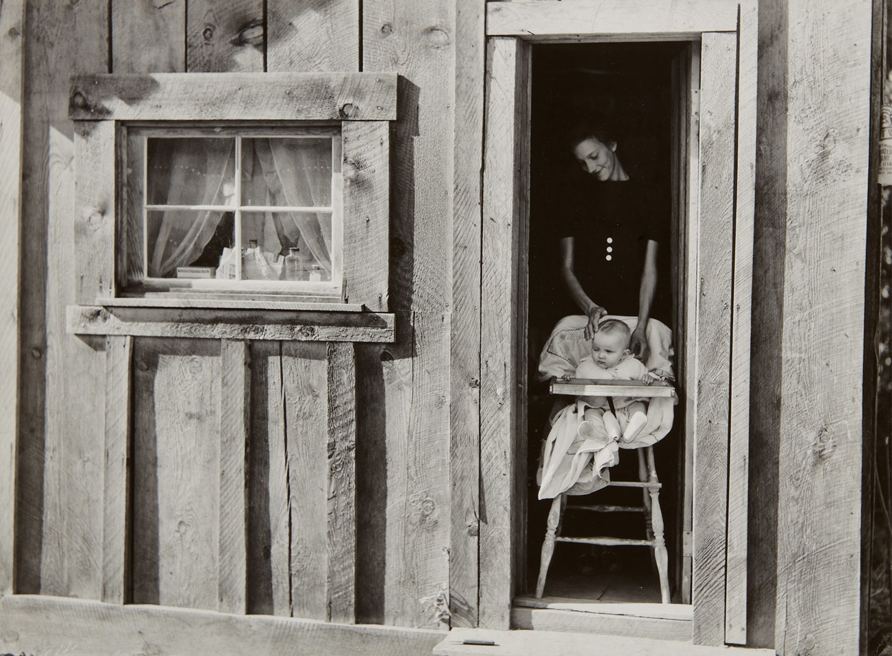 《奧拉自助鋸木廠合作社主席的妻兒在家門口, 愛達荷州寶石縣》