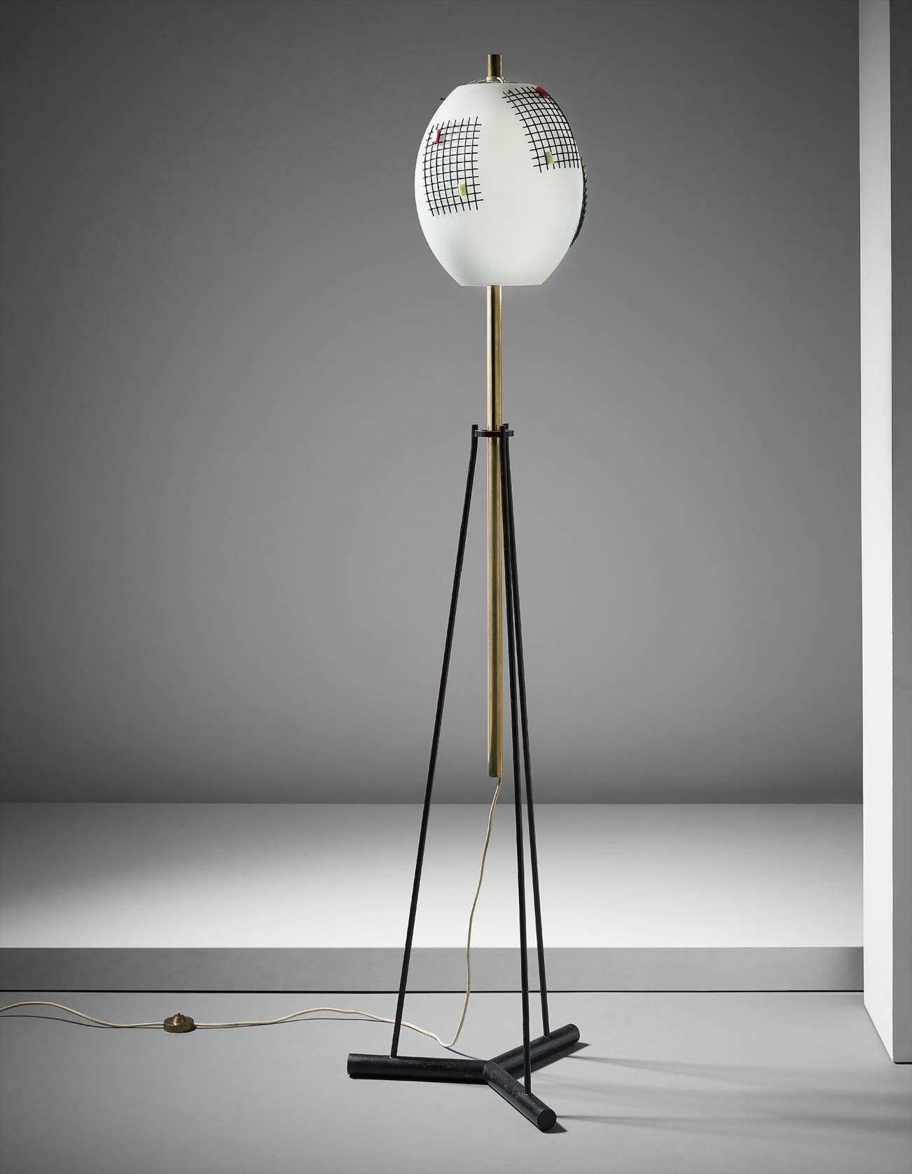 Painted tubular metal, tubular brass, brass, opaque glass, acrylic.