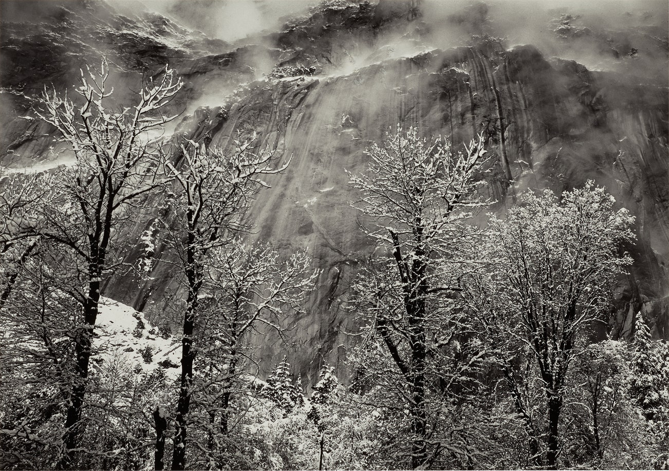 《加州優勝美地國家公園冬季鷹峰的樹木和懸崖》