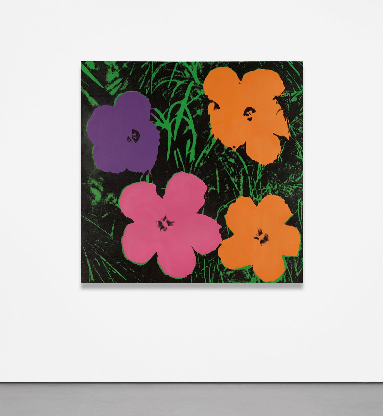 The inception of the Flowers paintings derived from four photographs of seven hibiscus blossoms that were published in a foldout of the June 1964 issue of Modern Photography. Captured by the magazine’s executive editor, Patricia Caulfield, the images illustrated the myriad visual outcomes possible from varying exposure periods and filter settings; thus, each reproduction possessed subtle tonal distinctions, a striking seriality that no doubt appealed to Warhol’s predilection for repetition and successive imagery. Warhol made substantial alterations to the source picture while adapting it for painting, including cropping it into a square composed of only four large flowers, rotating individual blossoms, and then transferring his new composition to several non-uniformly sized screens. Afterwards, the artist and his studio assistants – known as the Factory – applied continuous, flat planes of paint to the canvas, typically emerald for the stems and a permutation of vibrant shades for the blossoms, before silkscreening the photographic representation, nearly always in pitch black, on top.