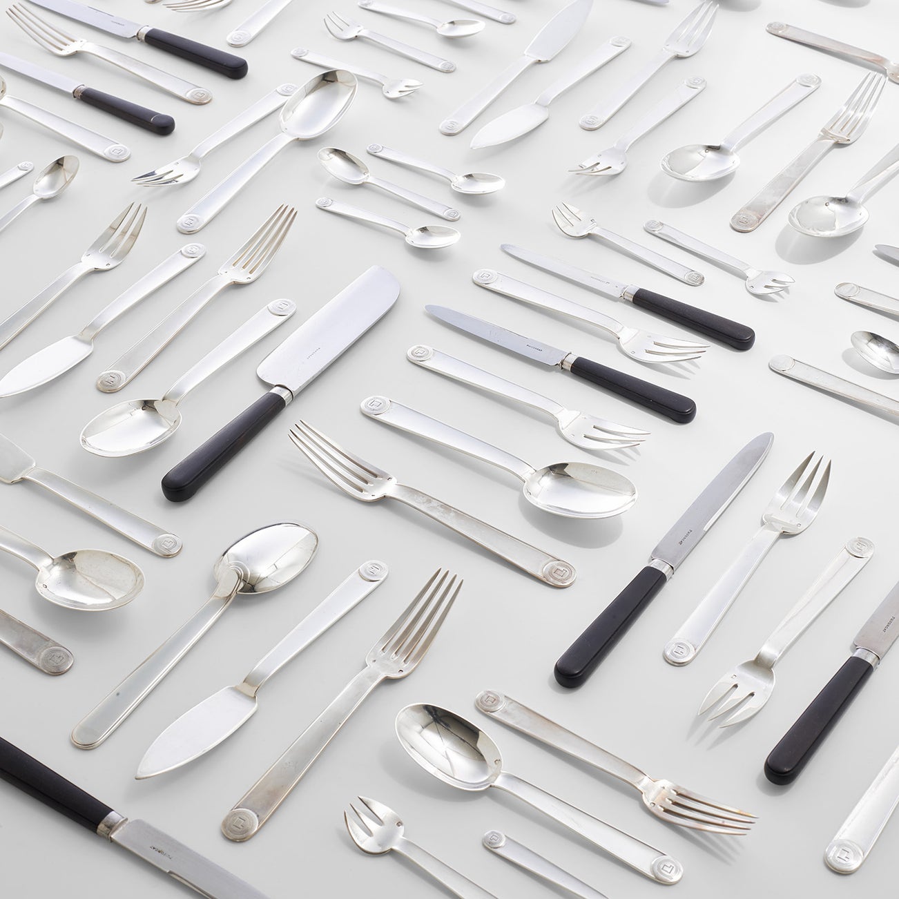 巴黎 Puiforcat 製作,包括12把餐叉、12把餐刀、12把餐勺、6把蠔叉、10把魚叉、10把魚刀、1把大刀、13把甜點叉、12把甜點刀、13把甜點勺、12茶匙(113)。