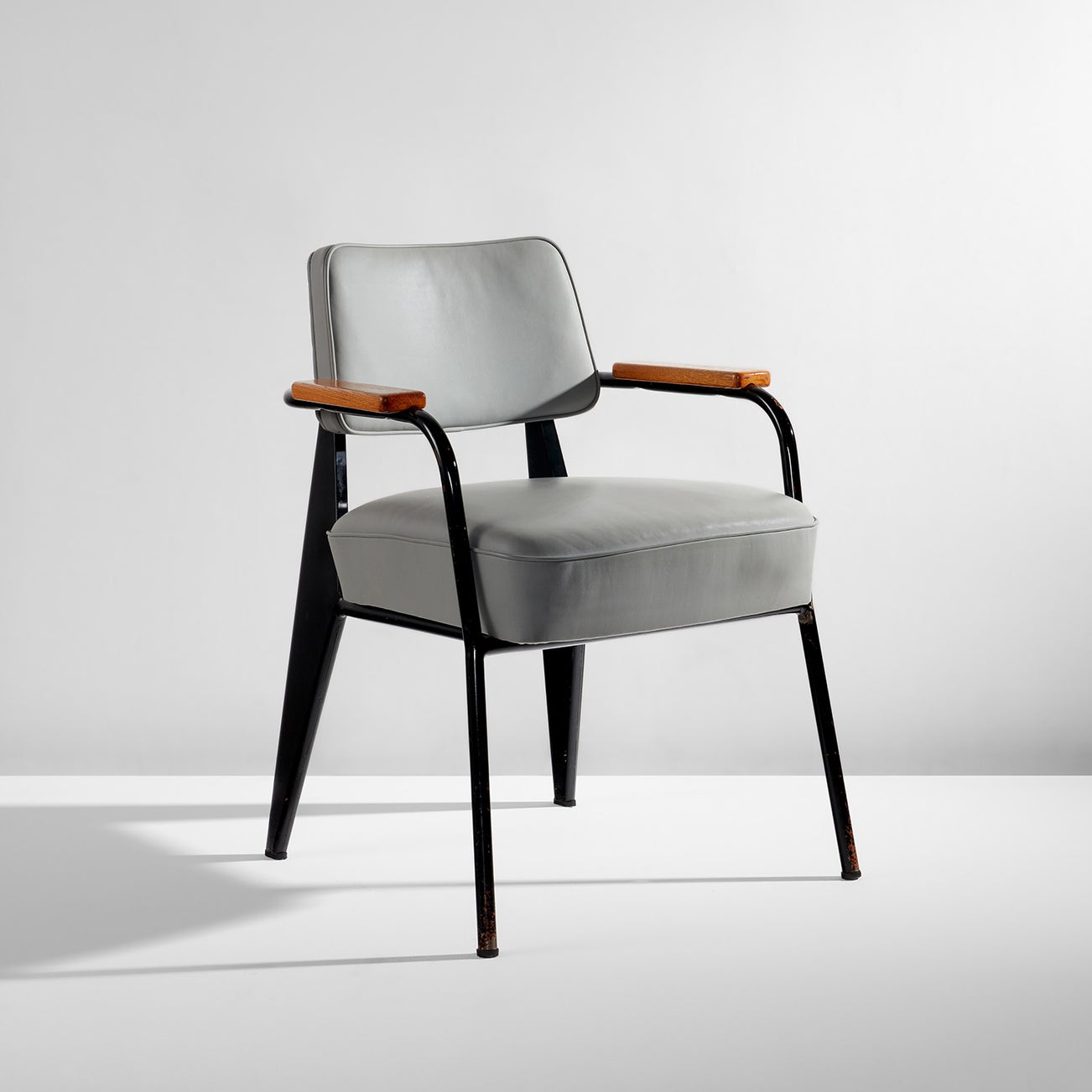 French | B. 1901 D. 1984Jean Prouvé believed in design as a vehicle for improvement. His manufactory Les Ateliers Jean Prouvé, located in Nancy, France, produced furniture for schools, factories and municipal projects, both within France and in locations as far flung as the Congo. Though he designed for the masses, pieces such as his "Potence" lamps and "Standard" chairs are among the most iconic fixtures in sophisticated, high-design interiors today. Collectors connect with his utilitarian, austere designs that strip materials down to the bare minimum without compromising on proportion or style.