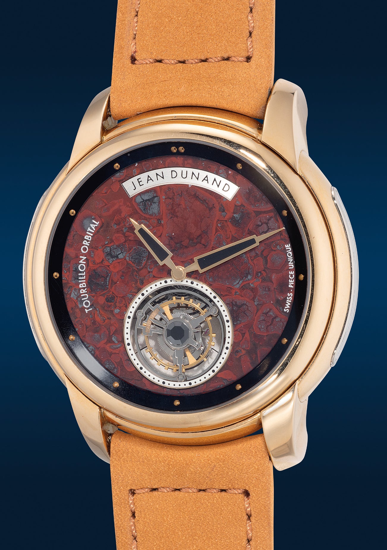 Adorned with a stunning red stone dial, reminiscent of the red lacquered art objects designed and crafted by Jean Dunand, the present piece-unique Tourbillon Orbital is a wristwatch of original design and architecture in which the entire movement rotates, carrying in orbit a one-minute flying tourbillon on a revolving dial. The combined rotation of the tourbillon and the movement is not only a marvel to behold, but it also significantly improves the stability of the watch’s performance.