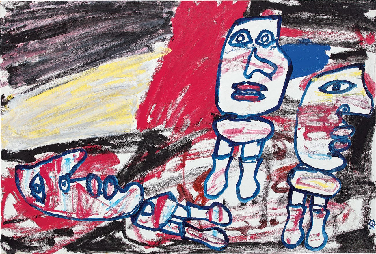 'My desire is to make the site evoked by the picture something phantasmagoric; and that can be achieved only by jumbling together more or less veristic elements with interventions of arbitrary character aiming at unreality. I want my street to be crazy, my broad avenues, shops and buildings to join in a crazy dance, and that is why I deform and denature their contours and colours.' Jean Dubuffet