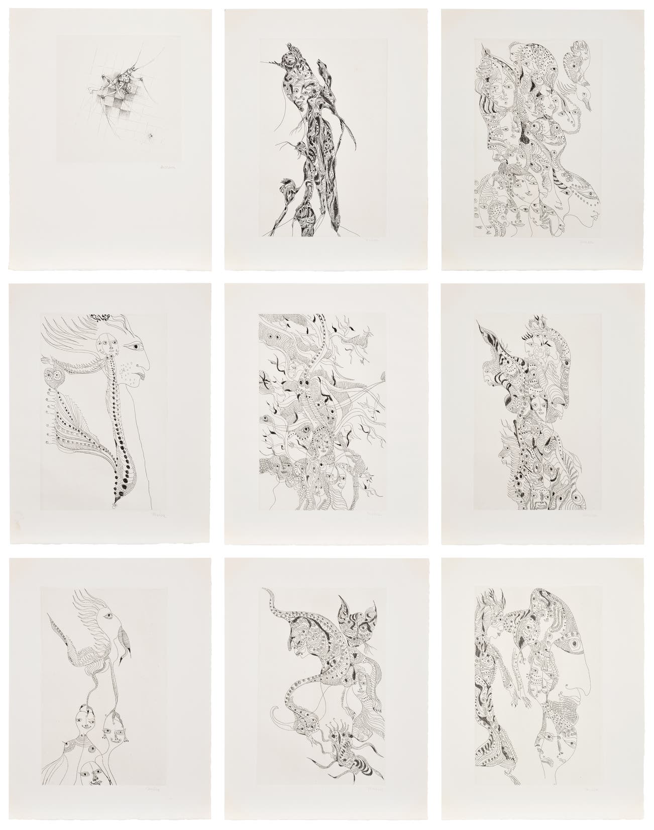 全套8組蝕刻版畫 幼點腐蝕 直刻版畫 BFK Rives紙本(四周留邊,折疊及散裝如出版所示)附標題頁及版權頁,存於原裝黑色布面文件夾及滑套,連金色印刷名稱