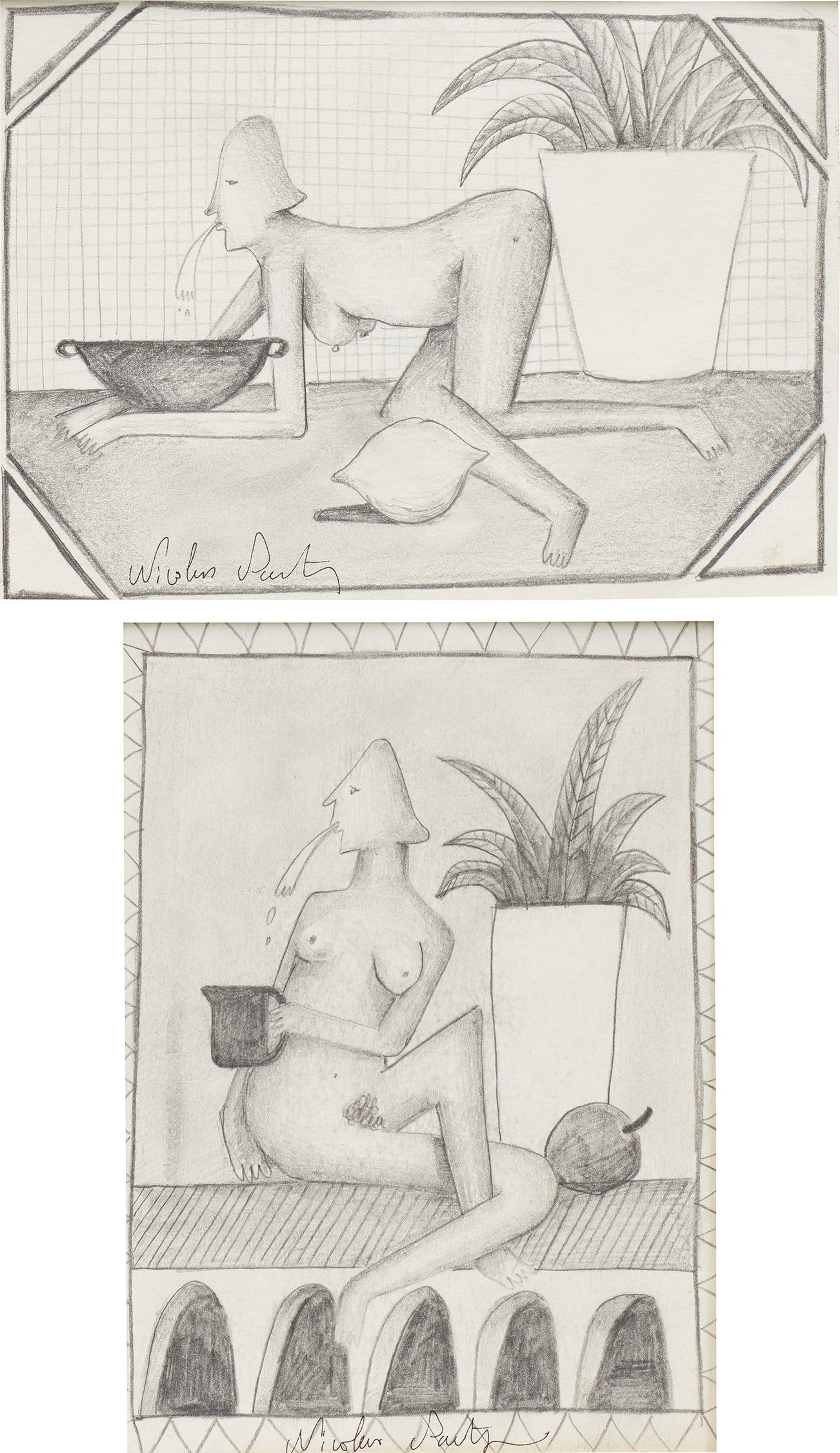 兩件作品:(i)《女人吐口水與裝有植物的花瓶》;(ii) 《坐著的女人吐口水與花瓶和蘋果》