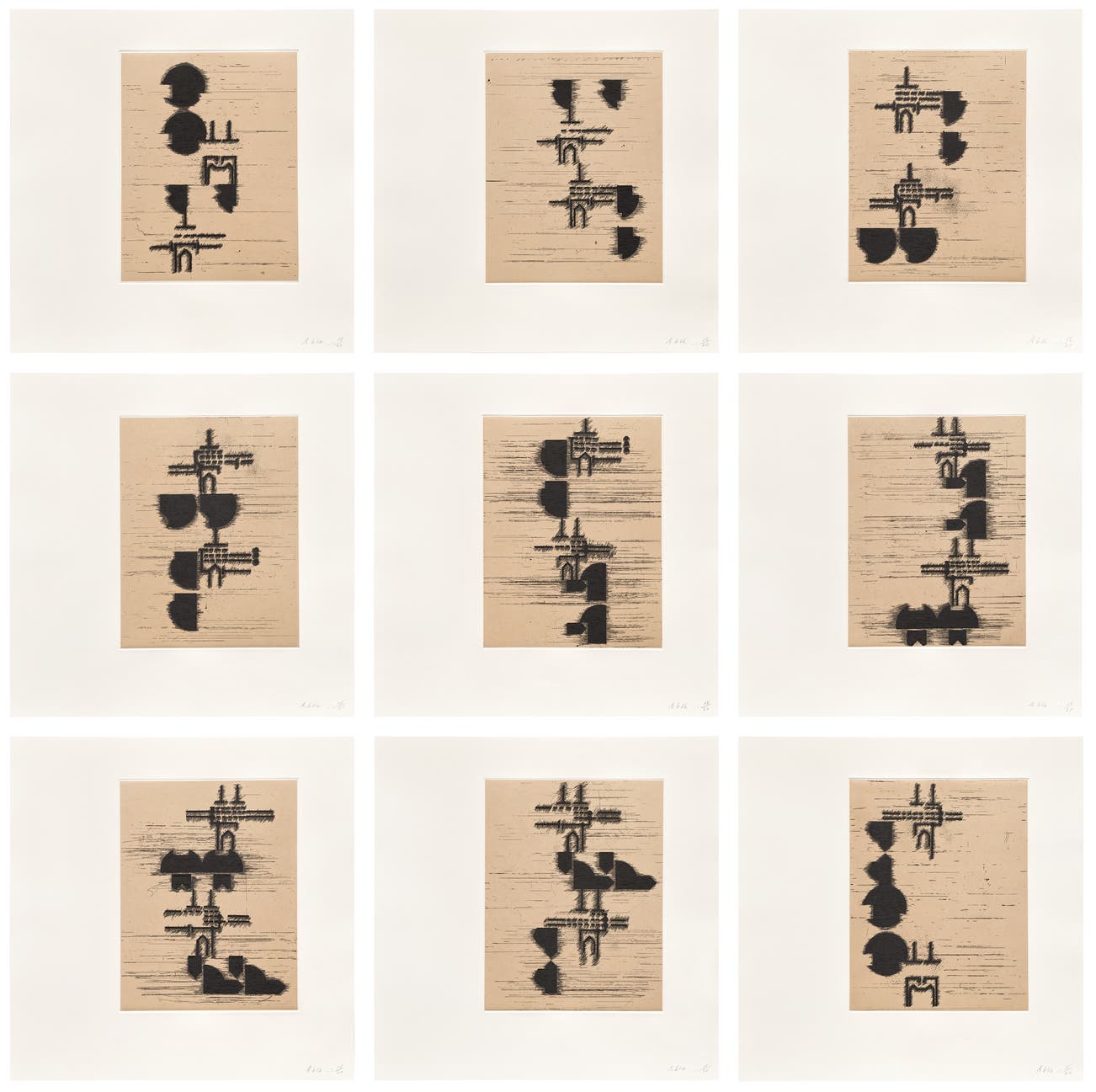全套九組蝕刻版畫及複印件 Gampi紙本粘於Magnani Pescia紙本(四周留邊,散裝如出版所示)附有標題頁和版權頁,全部包存於原裝米色麻布作品集,連浮雕標題