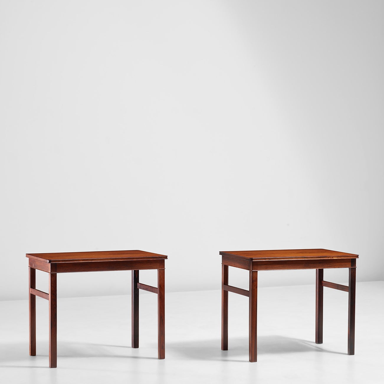 A consisting part of modern Danish design was the architect’s capacity to work in a variety of scales - often a given project encompassed the shaping of the surrounding landscape, the construction, and the interior decoration. The present set of furniture from the Nyegaard villa is crafted in Brazilian rosewood with metal details. The combinations of wood and metal are emphasized in the shapes of the furniture. The softly rounded wood is contrasted in the clarity of the well-defined transition from leg to armrest. Reflections on traditional furniture are visible in the execution of the pieces, which are meticulously made and show exquisite craftsmanship. The constellation of forms creates a unity of elegance and function. The works of Frits Schlegel cover buildings in the Copenhagen Zoo, official buildings, villas furniture and lighting design. The mass of his concrete uses in architecture contrasts with the delicate features of his furniture designs. His works holds a variety of details to be examined close by or from afar, showing Schlegel´s capacity to operate in different scales.