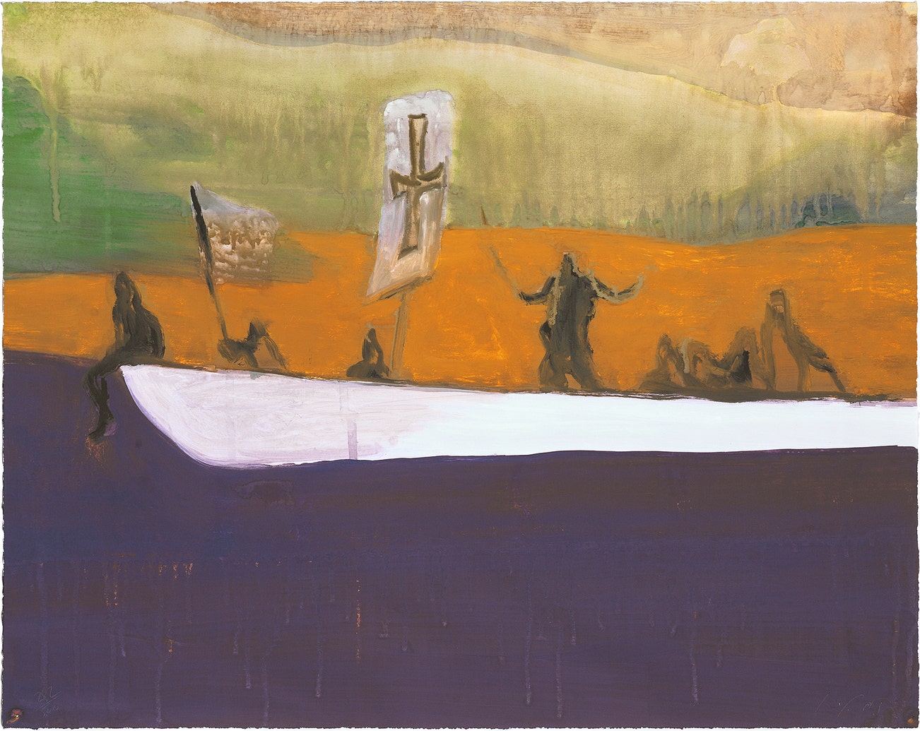 Doig draws on personal memories and source imagery in his pursuit of exploring the slippage between reality, imagination and memory through painting. The material properties of paint and expressive possibilities of color thereby serve to approximate the foggy, inarticulate sensation of remembering. His practice maintains a thin and balanced line between landscape and figure, superimposing photographic imagery and memories, both real and imagined.