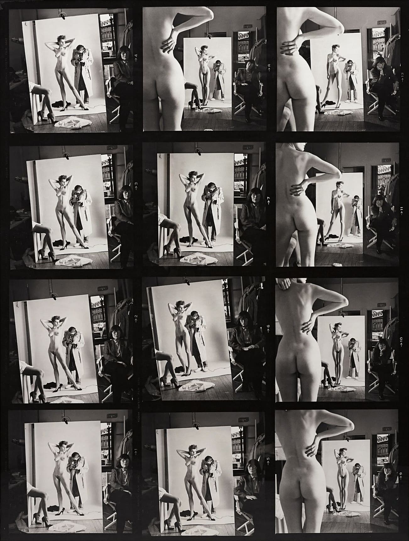 Helmut Newton created a world as coherent as any novelist or as arresting as any visionary painter. Astoundingly, he built this world with great success within the confnes of fashion photography. From inside this soft, sensual and humorous tableaux, he creates a place inhabited by larger-than-life women who dominate their domestic arenas with varying degrees of fetish. In the oversized contact sheet entitled Self Portrait with Wife and Models, we are privileged to witness the creation of one of these tiny utopias: the master and his muse, exposure of naked skin, the repetition and rhythm of curves and spikey heels, and finally, the realisation that everyone in the image has become the model. How superbly Newtonian.