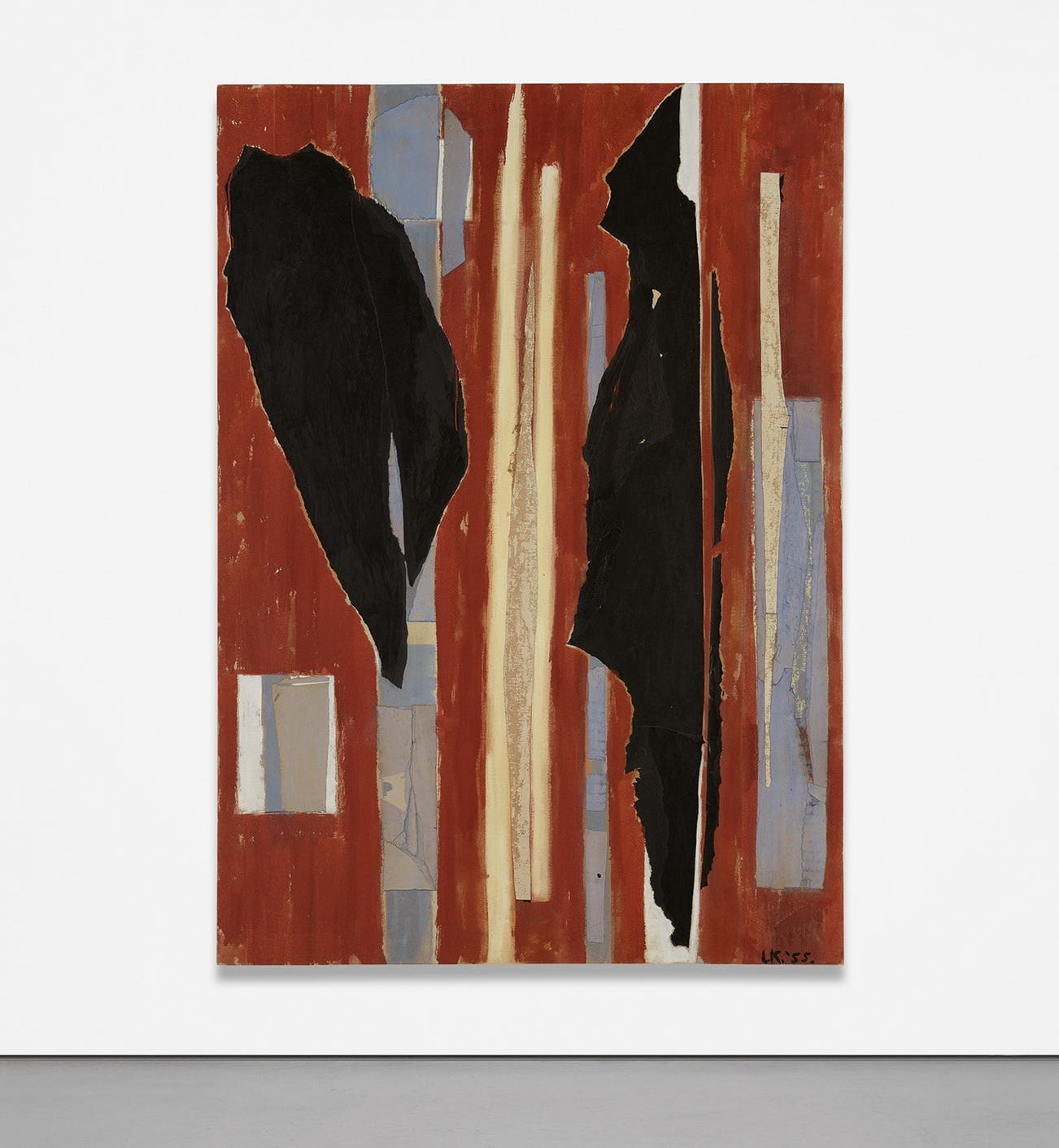 In Lame Shadow, two large black forms are interspersed by mostly vertical strips of canvas, atop and below which pale blue and brick red oil paint stains the surface. As described by Bryan Roberston, Lame Shadow evokes a “calm stillness…in which torn, dark, collaged shapes appear to float over the attenuated vertical bands of lighter color which illuminate the center of the painted ground…as if the collaged elements were becalmed in a mysterious space or suspended in some unfathomable substance or solution” (Bryan Robertson, Lee Krasner: Collages, exh. cat., Robert Miller Gallery, New York, 1986, n.p.). Its composition resembles a plate called Le Cow-boy, from Matisse’s papier découpé album Jazz published in 1947, in which two silhouetted human-like shapes face inward atop a background of blue, yellow and green stripes. Krasner would have been familiar with works like these after seeing a show of the French modernist’s collages at Pierre Matisse Gallery, New York in 1949. Lame Shadow simultaneously resembles Robert Motherwell’s contemporaneous Elegies begun just a decade earlier. While he used paint to create his own shadow-like forms, Krasner relies on pasted paper, something Motherwell himself would employ in his own collages of the 1970s.