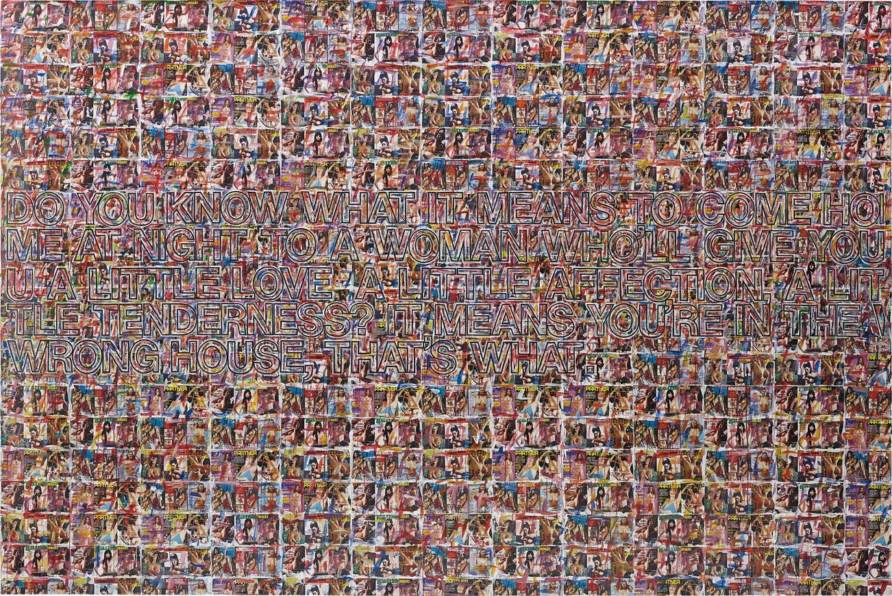 Prince began creating his Joke Paintings in 1985. The artist appropriated the jokes from various sources such as cartoons and joke books re-contextualising them within the realm of fine art. His earlier examples were hand-written, then silk-screened onto monochrome canvases, with no background or additional imagery. Likewise, paintings like Ed Ruscha’s, Sex, 1981 focused on the vernacular to show how words alone instantly assembles explicit images in one’s mind. What it Means, shows the progression of his Joke Painting series, as it includes a rich background of collaged images. While the previous works in the series mainly focused on the language, here the text is more difficult to decipher amidst the busy background of cropped pornographic images. The joke, originally meant to be read with attention becomes a pictorial and graphic composition. It reads: ‘Do you know what it means to come home at night to a woman who’ll give you a little love, a little affection, a little tenderness? It means you are in the wrong house, that’s what.’ The joke is disconcerting to the viewer as one is confronted with lyrical adultery and sarcasm.