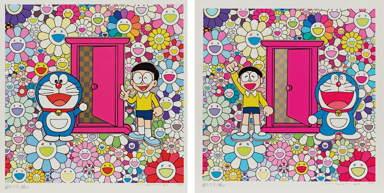 兩件作品: (i)《花田上的任意門 (叮噹)》; (ii)《通過任意門來到花田中的我們》